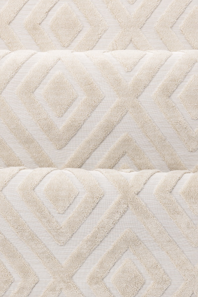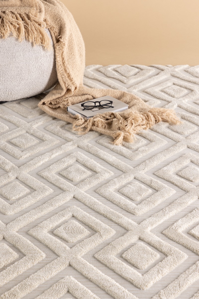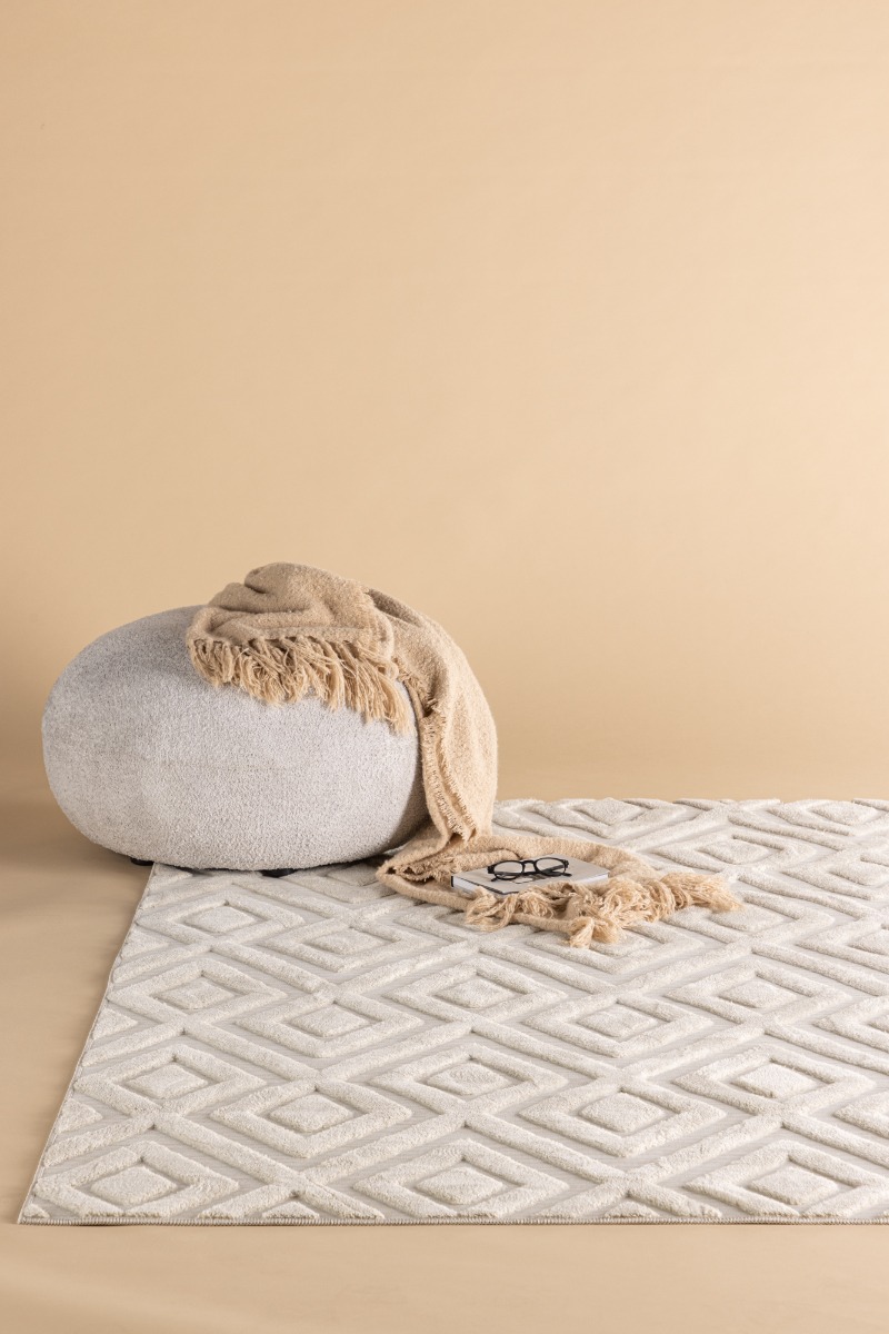 Mjuk vit ryamatta i 160x230 cm för extra komfort och stil. Tillverkad i slitstark 100% polyester med bomullsunderlag för stabilitet och enkel rengöring.