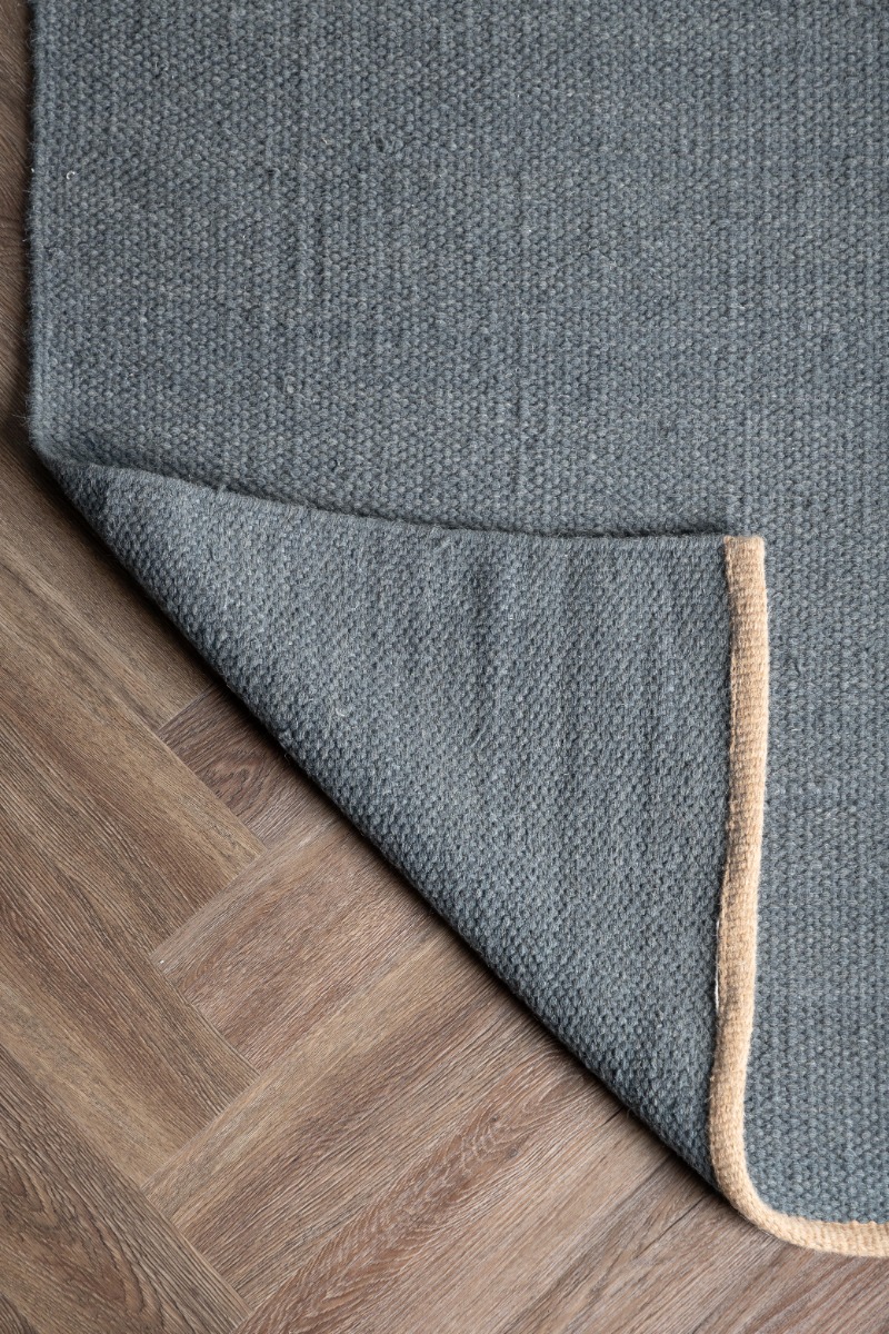Mjuk blå ullbomullsmatta som kombinerar komfort och hållbarhet. Perfekt för ett varmt och stilfullt hem.