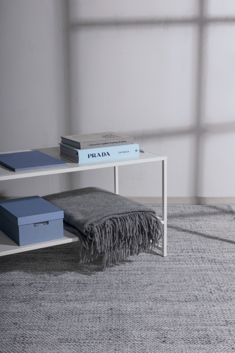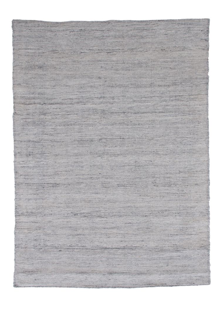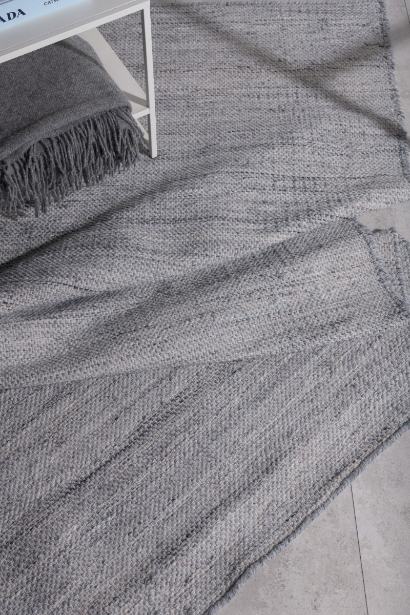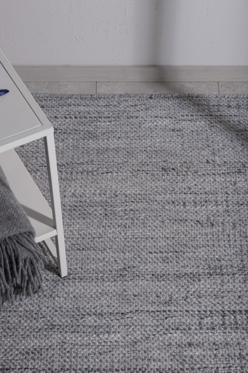 Silvergrå, handvävd plast- och bomullsmatta med tät väv och mjuk känsla. Perfekt för alla rum som vill ha stil och hållbarhet i ett.