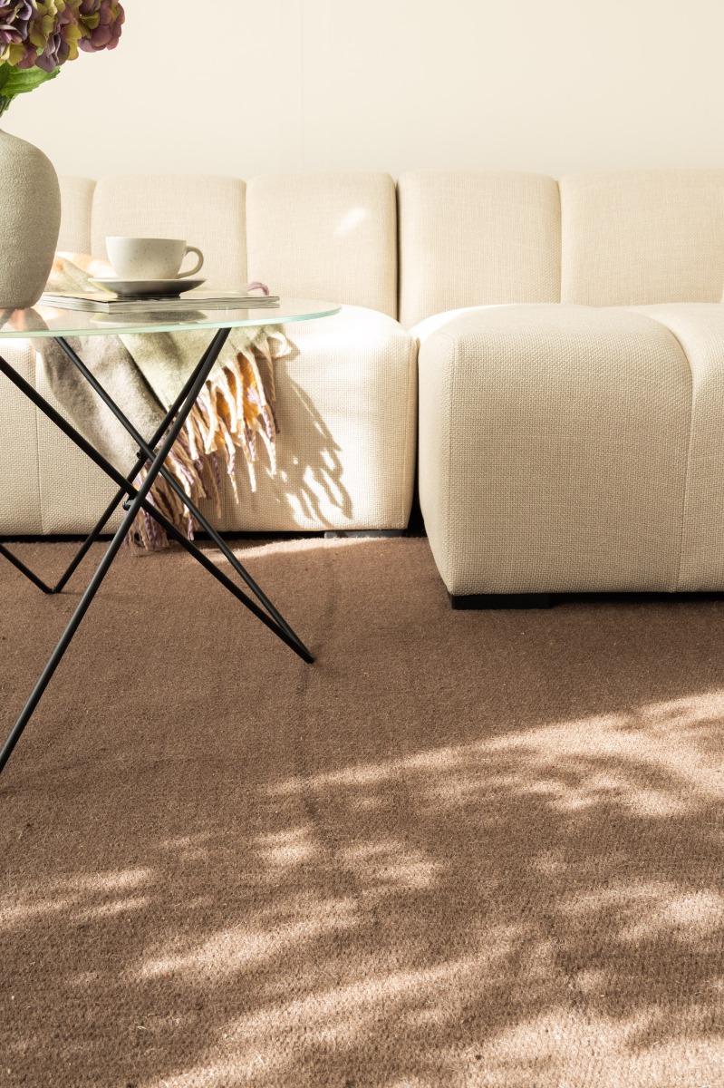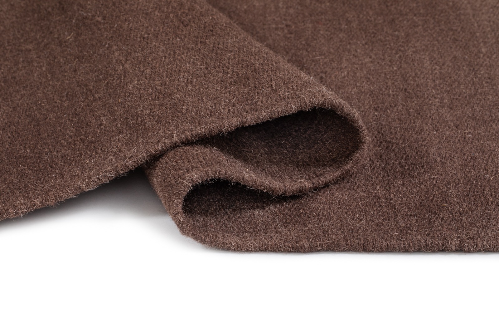 Handvävd kvadratisk ullmatta i djup choklad med naturlig glans och slitstark väv. Perfekt för varm, ombonad känsla i hemmet och enkel skötsel.