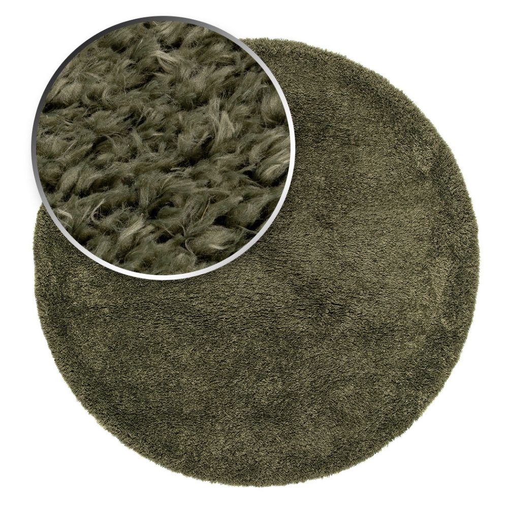 Grön rund ryamatta med mjuk lugg och hållbart material. Perfekt för att skapa en varm och elegant atmosfär i hemmet.