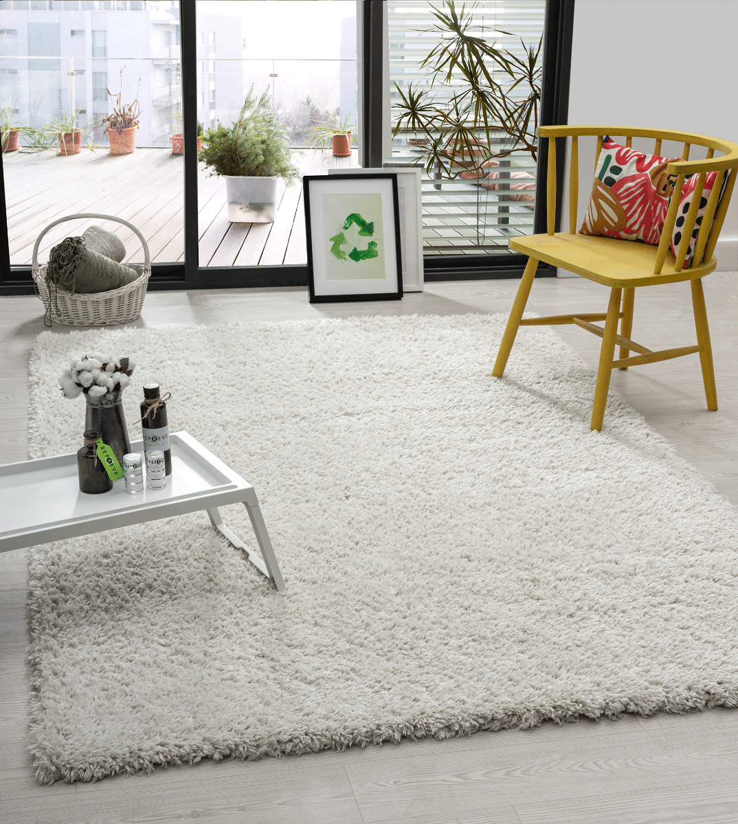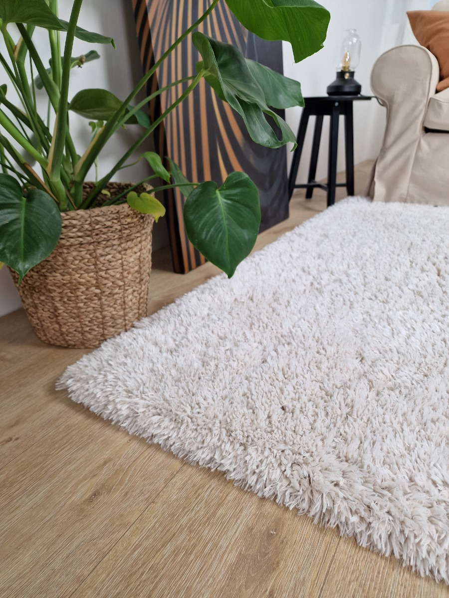 Mjuk och miljövänlig vit ryamatta i 100% återvunnen polyester med tjock, fluffig lugg. Perfekt för en varm och elegant känsla i hemmet.