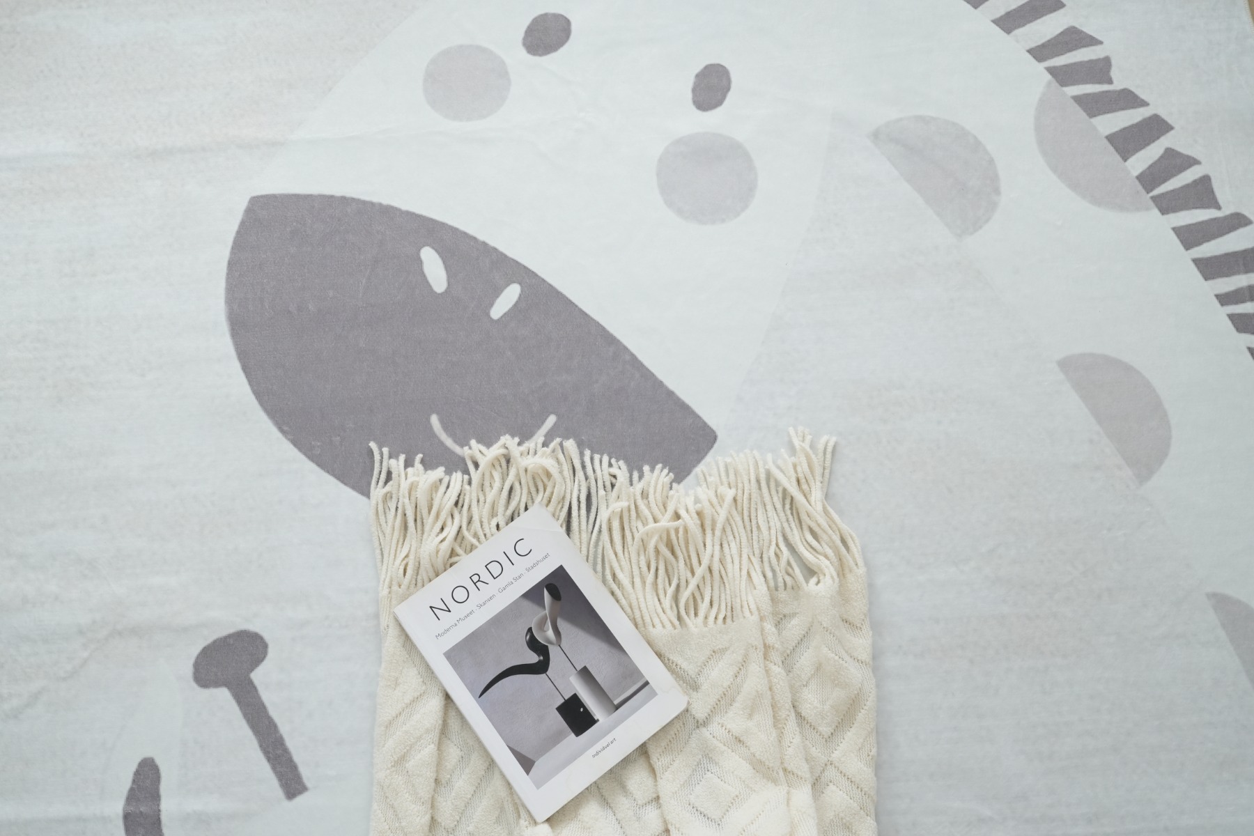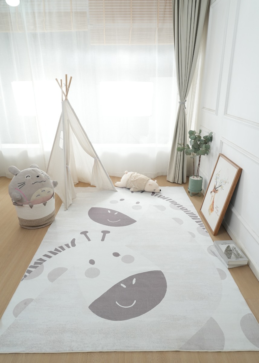 Lekfull och mjuk barnmatta med giraffmotiv i kräm. Ger en bekväm och trygg yta för lek och vila i barnrummet med enkel rengöring.