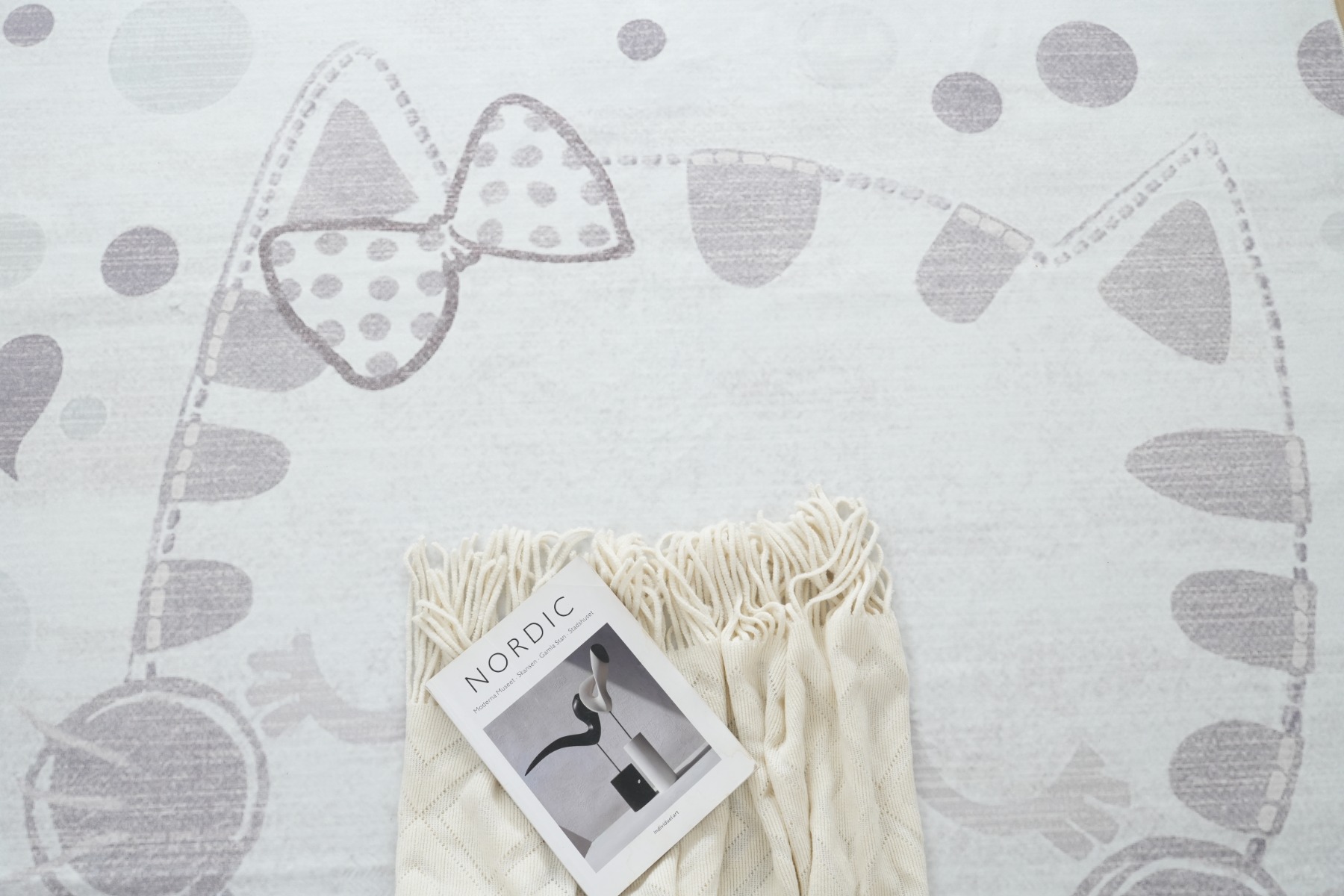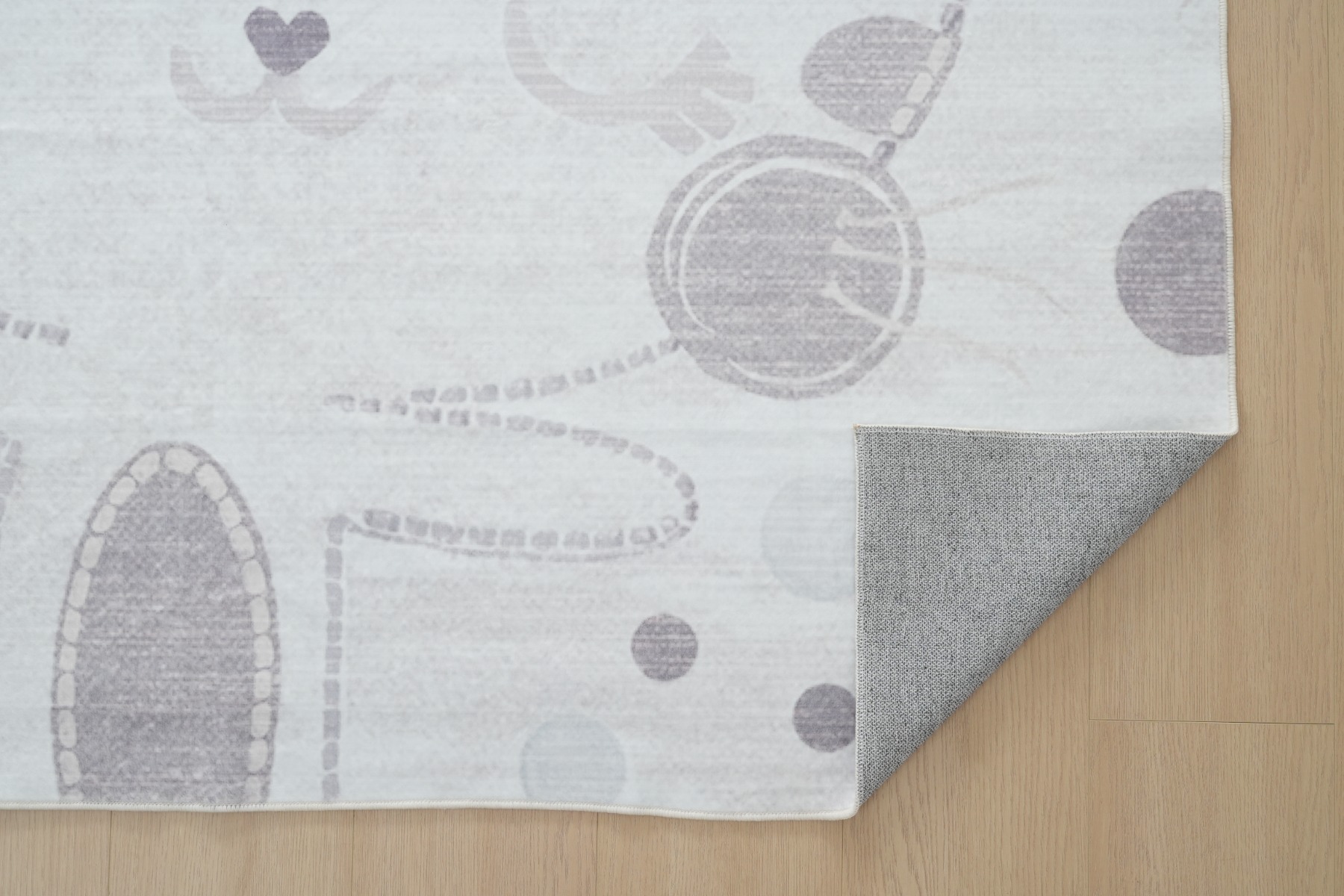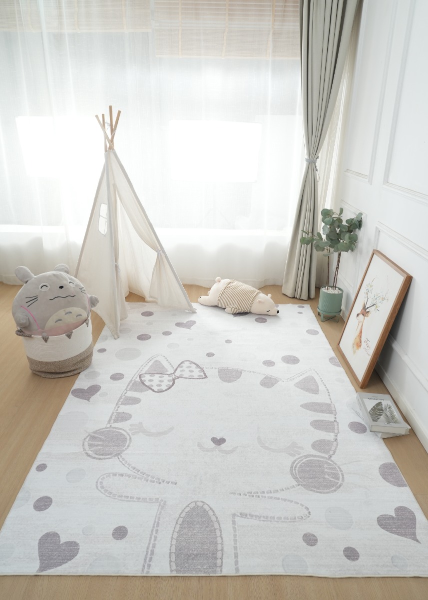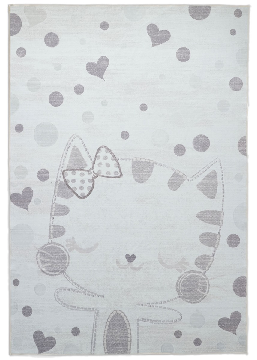 Mjuk och slitstark barnmatta med lekfullt kittymotiv i krämfärg. Bekväm 10 mm tjocklek som passar perfekt för lek och vila i barnrummet.