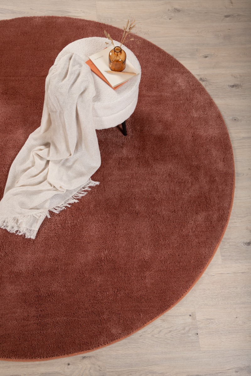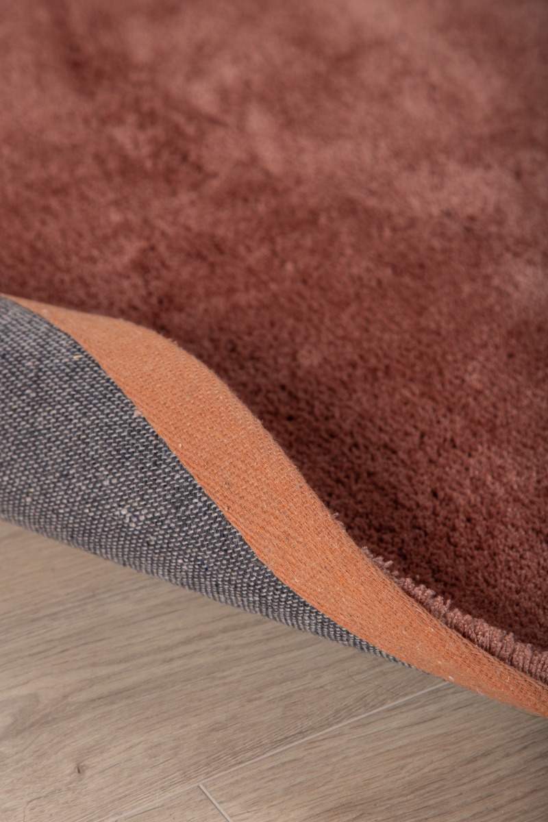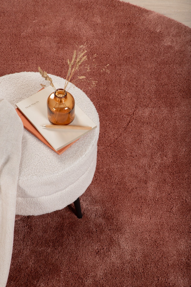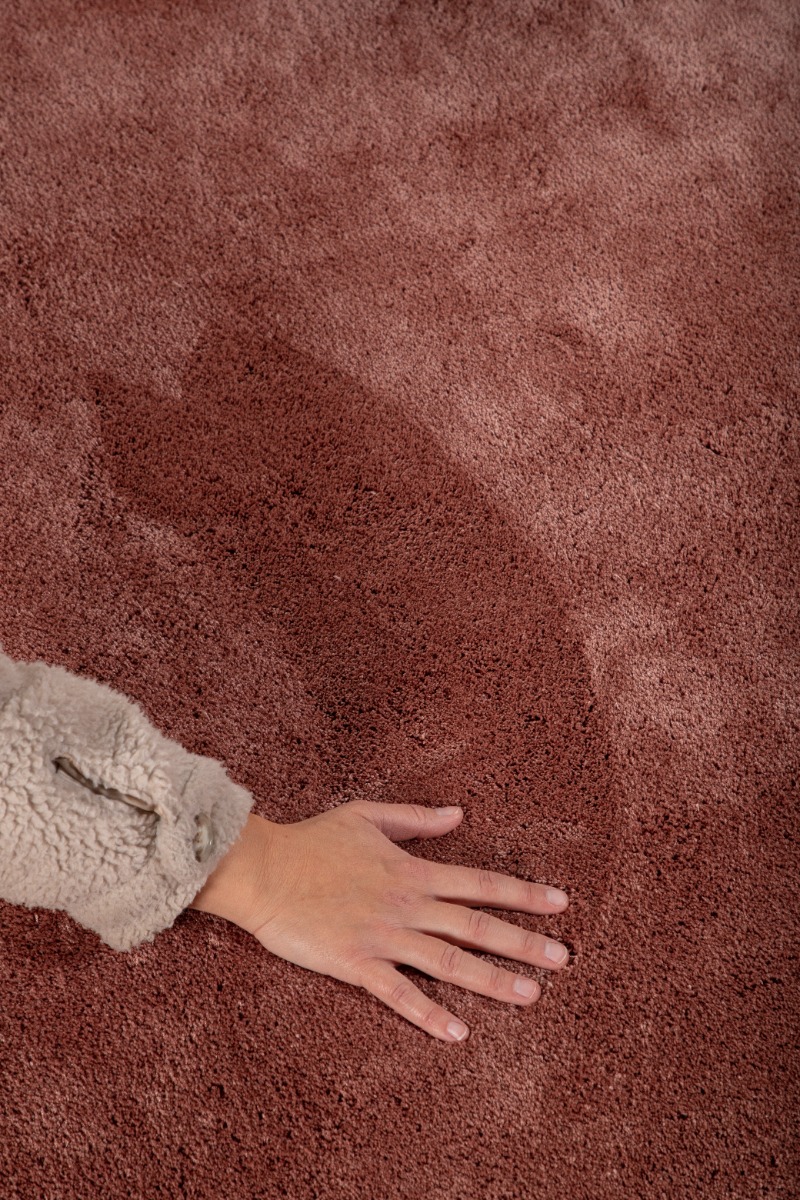 Mjukt glansfull rosa ryamatta i slitstark polyester med cirka 15 mm tjocklek. Perfekt för att skapa en varm och stilfull atmosfär i ditt hem.