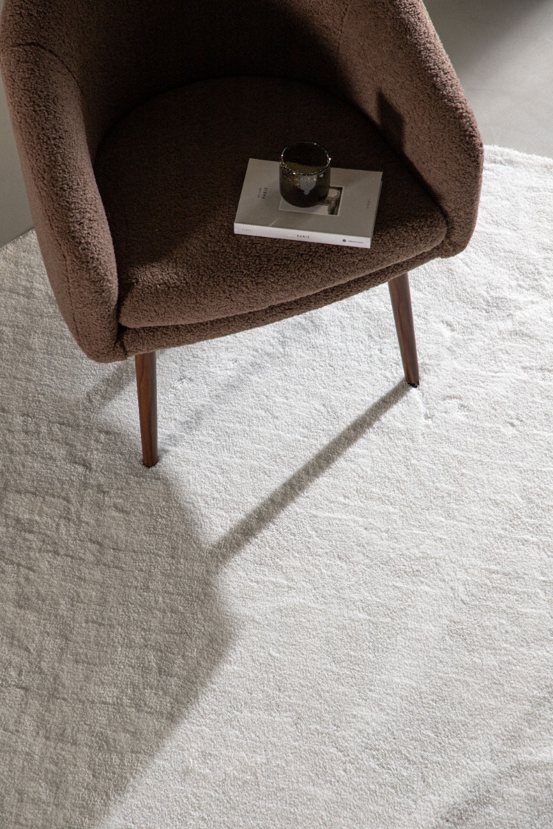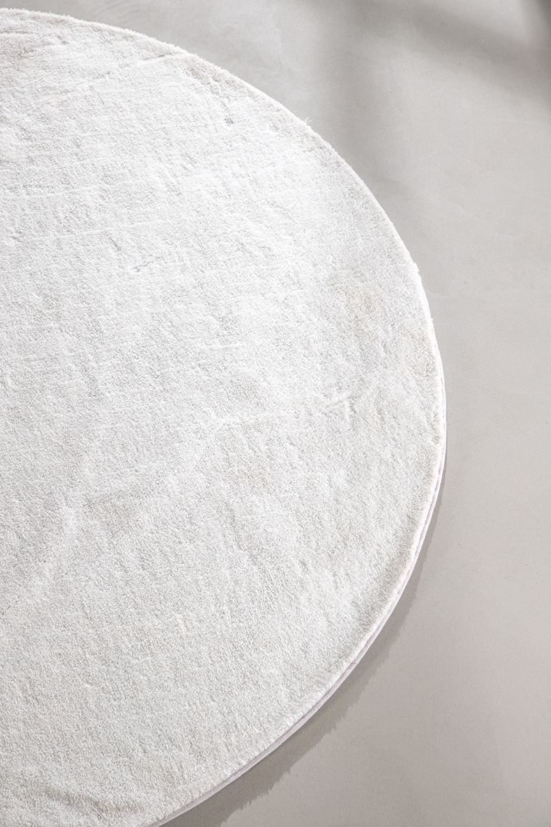 Mjuk och stilren vit rund ryamatta i 100% polyester. Perfekt för att skapa en inbjudande och elegant atmosfär i alla rum.