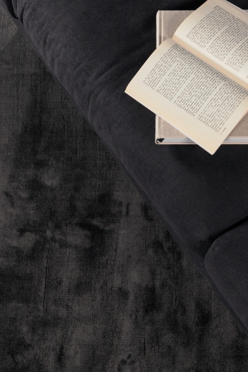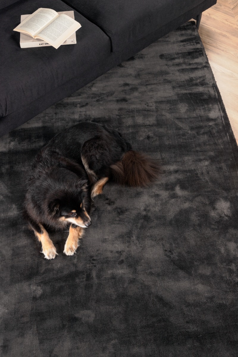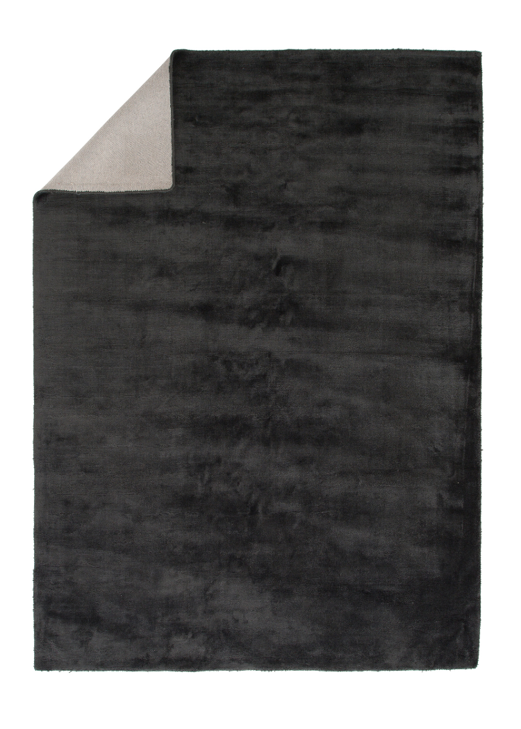 Stilren och mjuk grå viskosmatta med bomullsundersida. Silkeslen yta med lätt glans som ger värme och elegans till rummet.