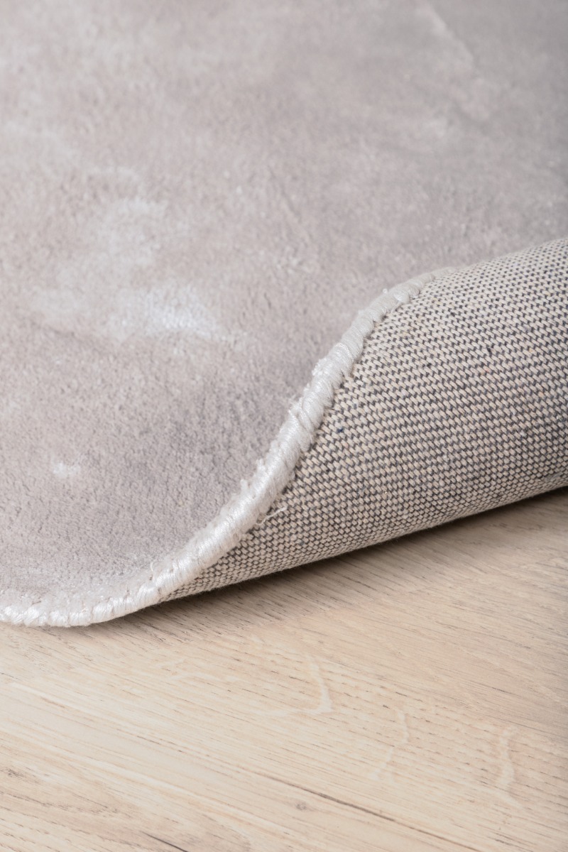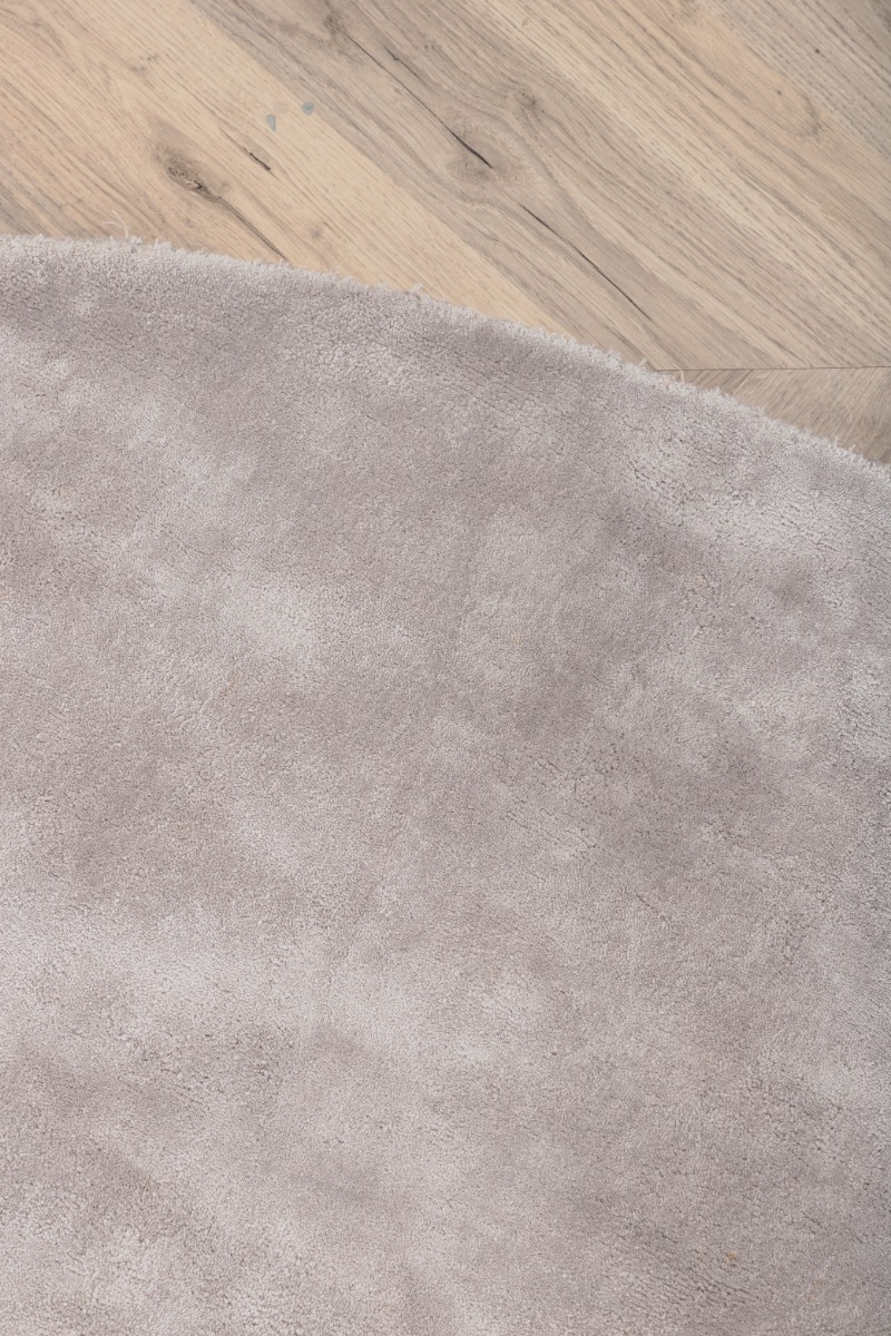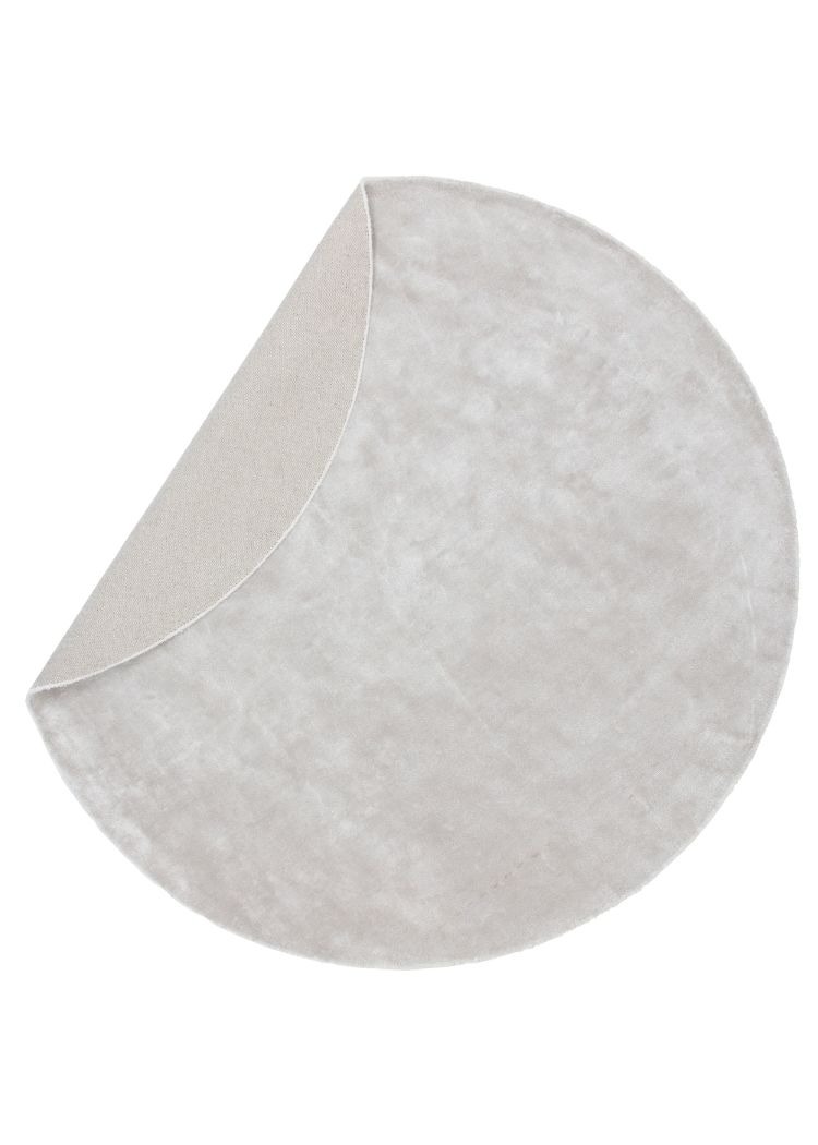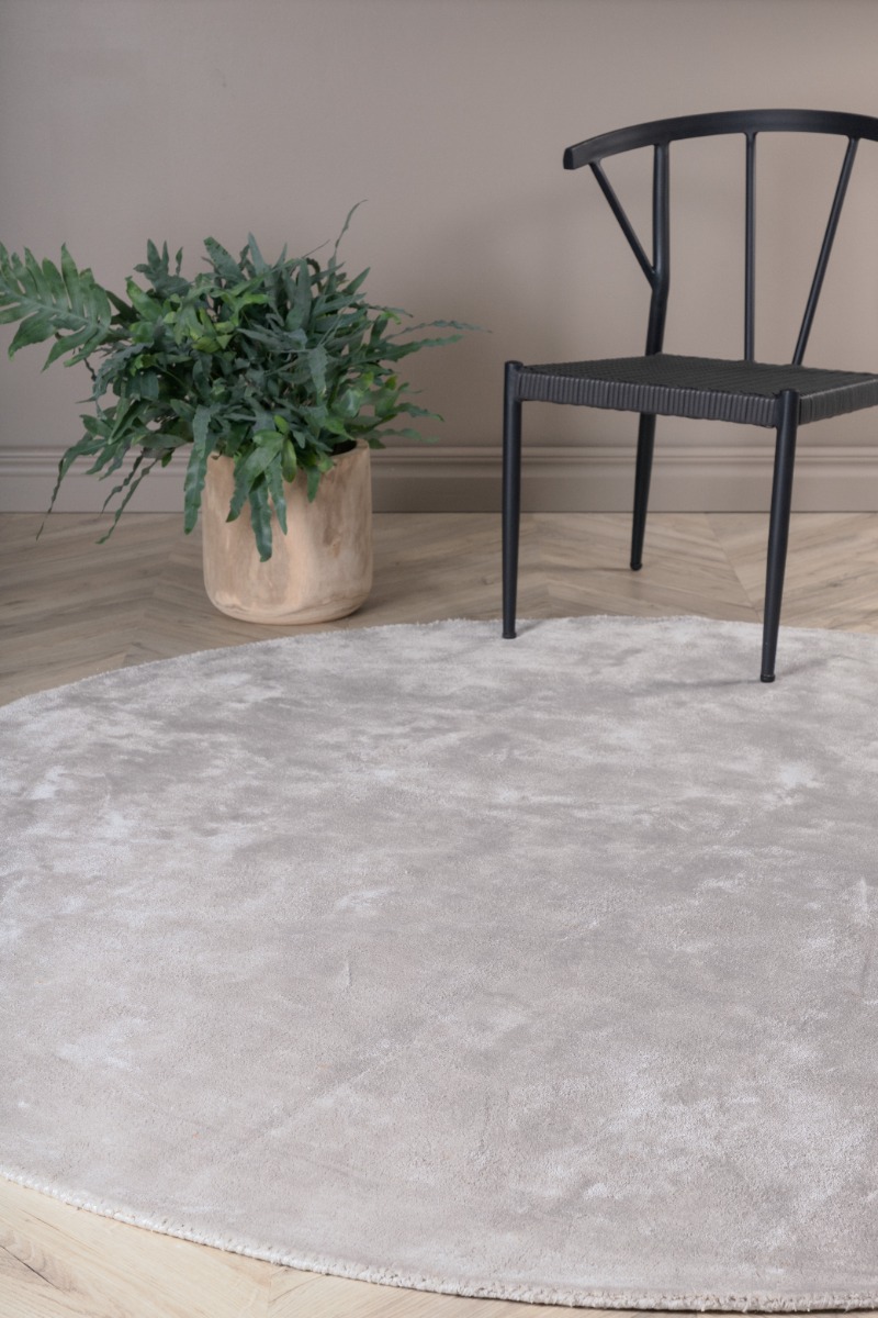 Elegant rund matta i silver av viskos och bomull med cirka 10 mm tjocklek. Mjuk, tålig och perfekt för stilfulla inredningar.