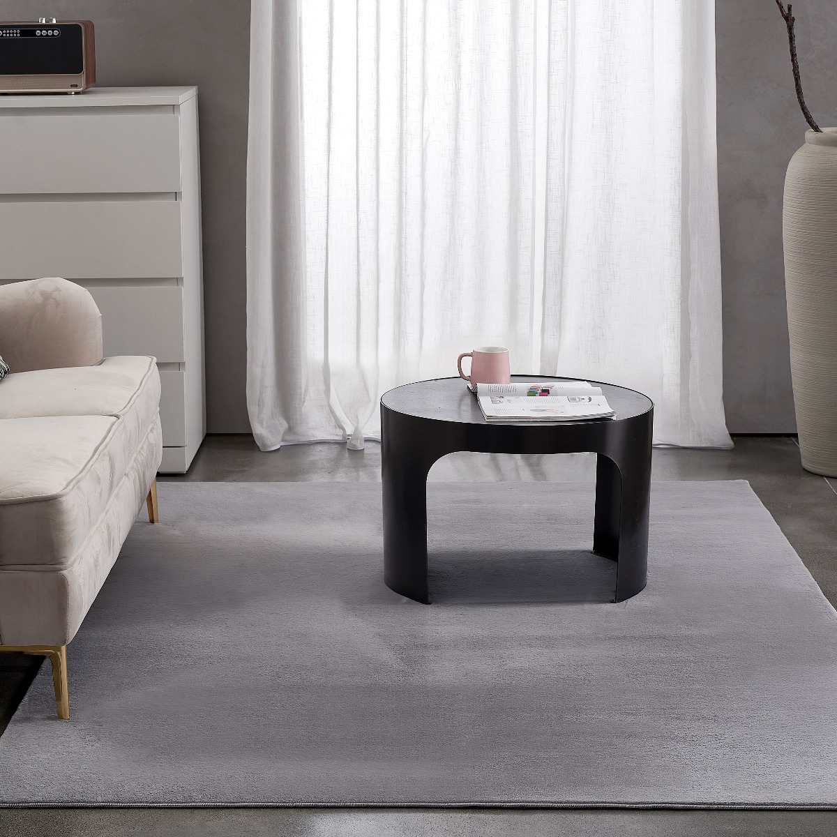 Silvergrå tvättbar pälsmatta med mjuk och tät lugg. Halkfri baksida och enkel att rengöra – ger värme och komfort till alla rum.