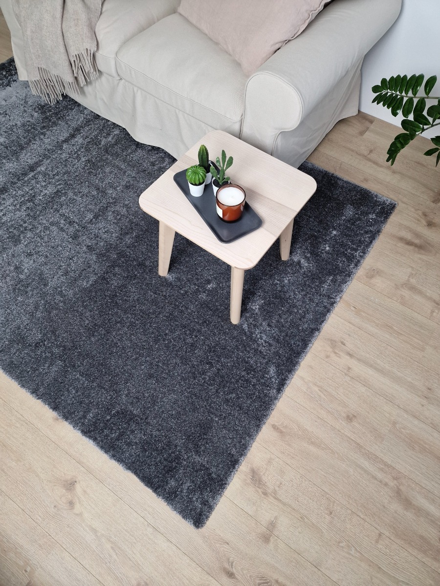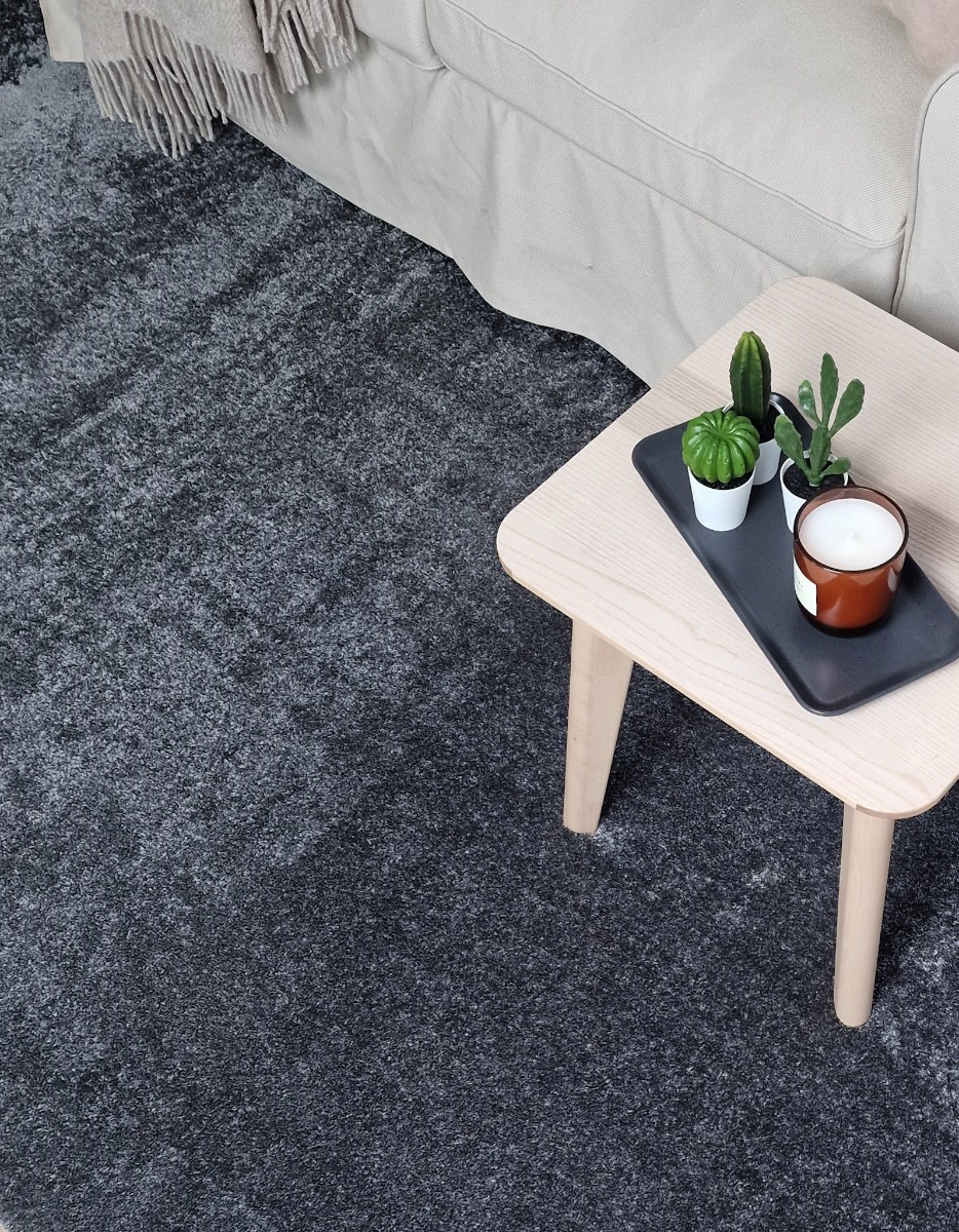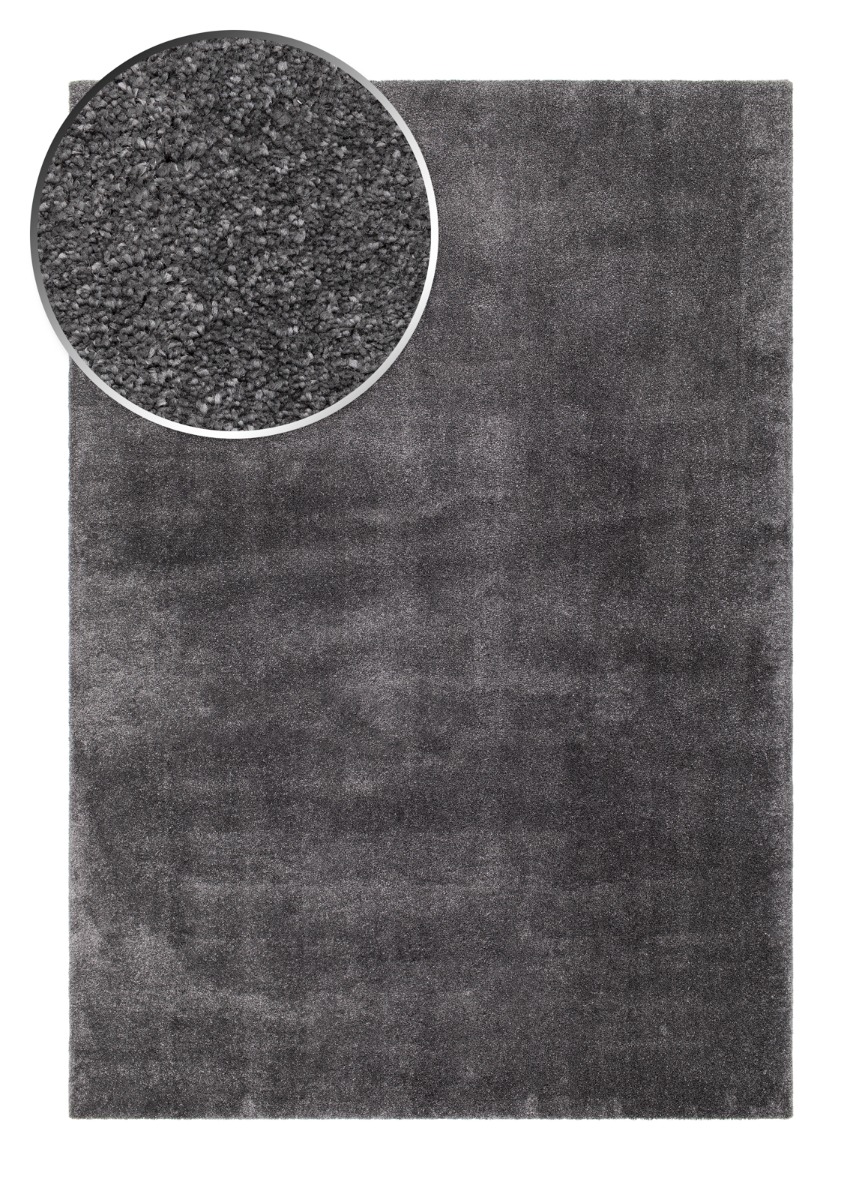 Mjukt grafitgrå ryamatta i supersoft microfiber med elegant lyster. Tvättbar, tjock och bekväm – perfekt för hemmet.