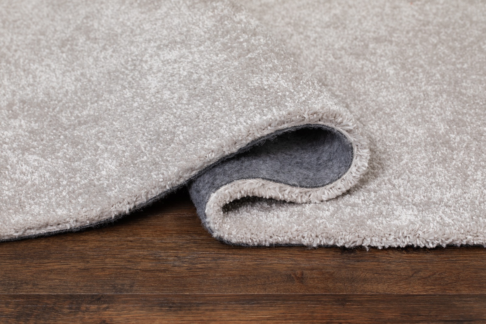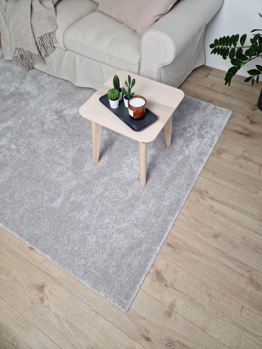 Silvergrå tvättbar ryamatta i mjuk mikrofiber med glansig lugg. Perfekt för ett elegant och lättskött golv i vardagsrum eller sovrum.