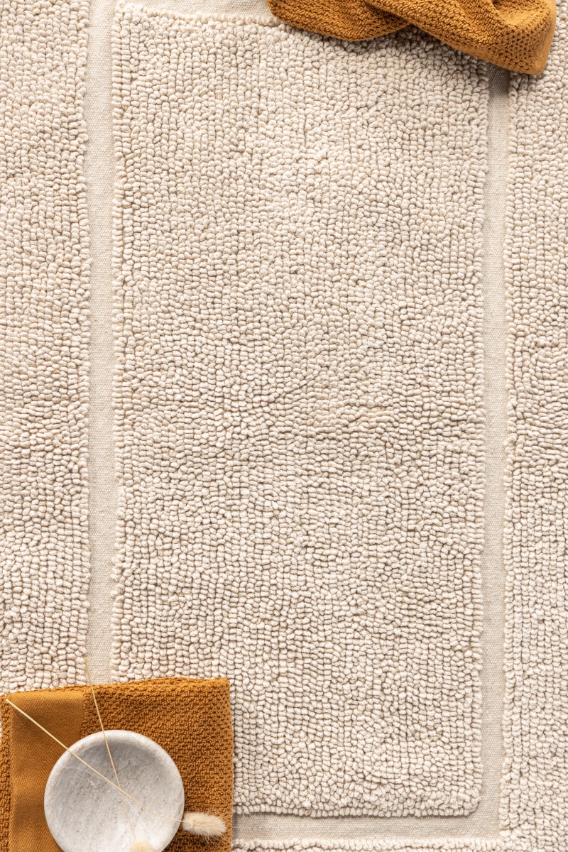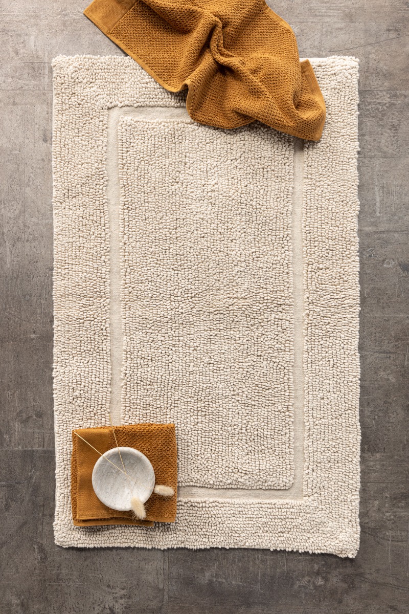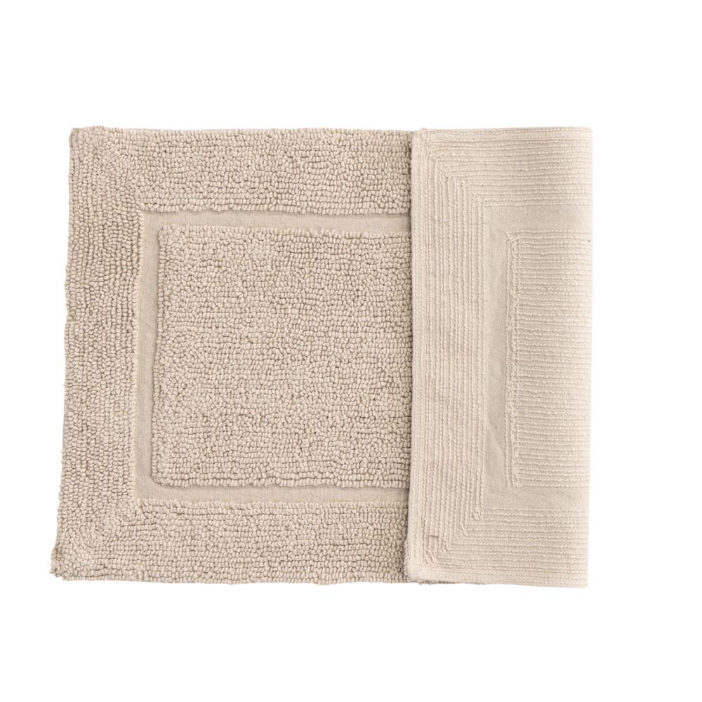 Mjuk beige badrumsmatta i 100% bomull med 10 mm tjocklek. Absorberande, halkfri och lättskött – perfekt för trygg och bekväm användning i badrummet.