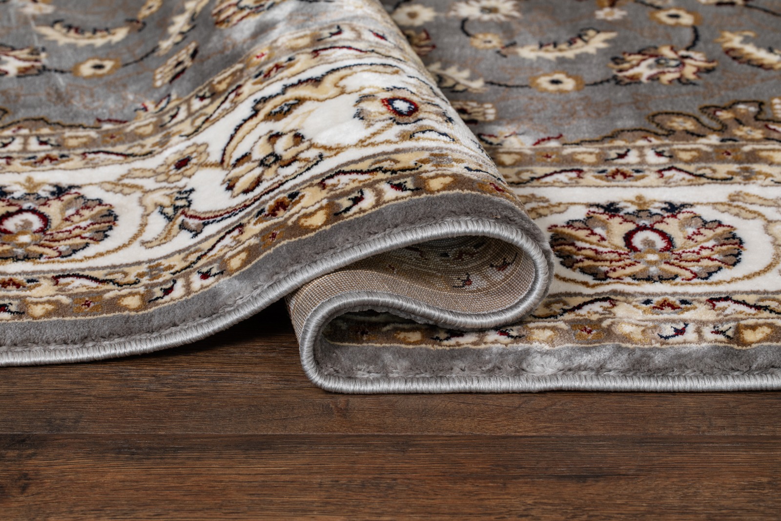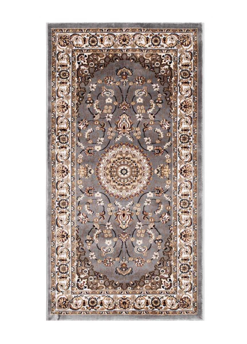 Doha Oma är en grå wiltonmatta med ett tidlöst orientaliskt medaljongmönster. Den ger en ombonad känsla och passar perfekt i både hall och vardagsrum.
