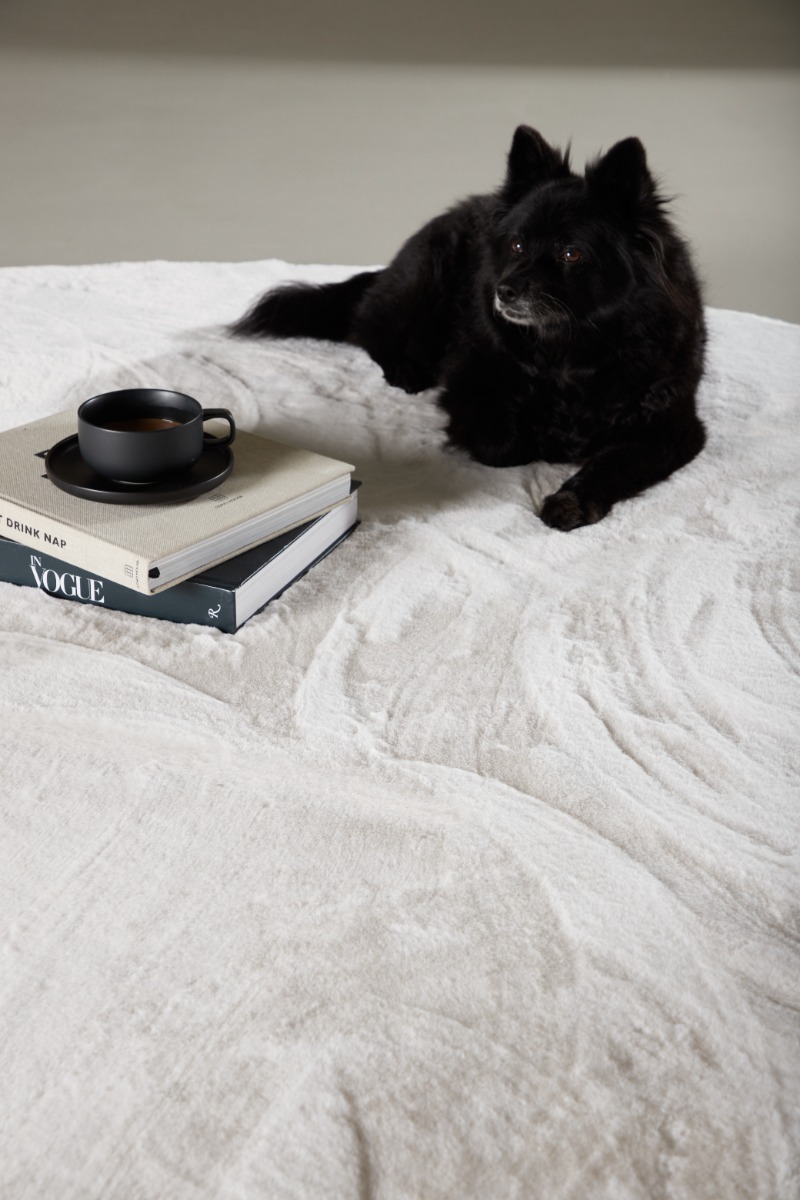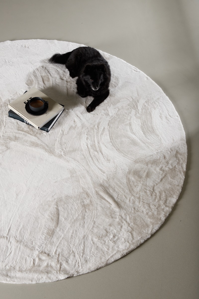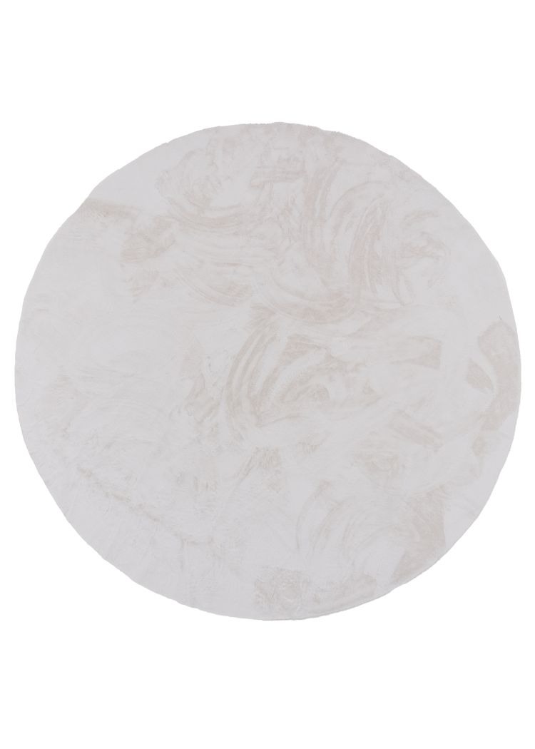 Mjuk och stilren rund vit ryamatta i 100% polyester med cirka 15 mm tjocklek. Perfekt för alla rum som vill ha en ljus, bekväm och lättskött golvkompis.
