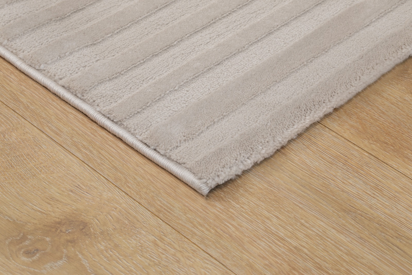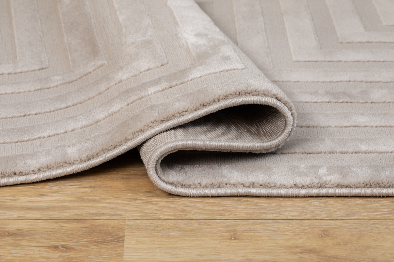 Elegant och slitstark gångmatta i mjuk linnefärg med modern grafisk design. Bekväm 15 mm tjocklek och halkfri baksida gör den perfekt för vardagsbruk.