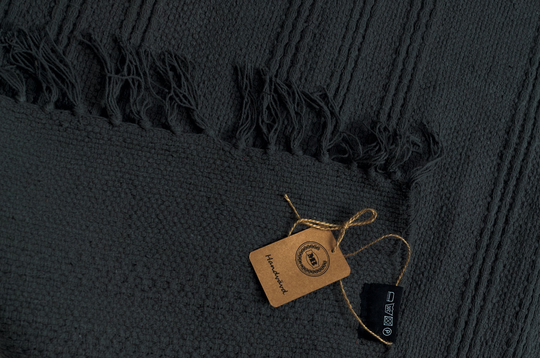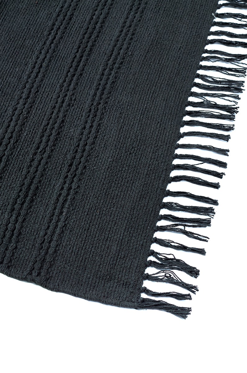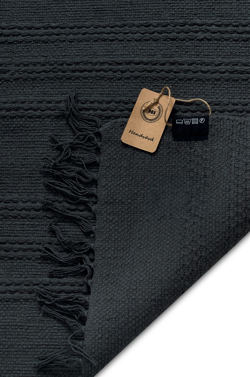 Handvävd antracitfärgad trasmatta i mjuk bomull med låg lugghöjd. Stilren, lättskött och bekväm för hemmet.