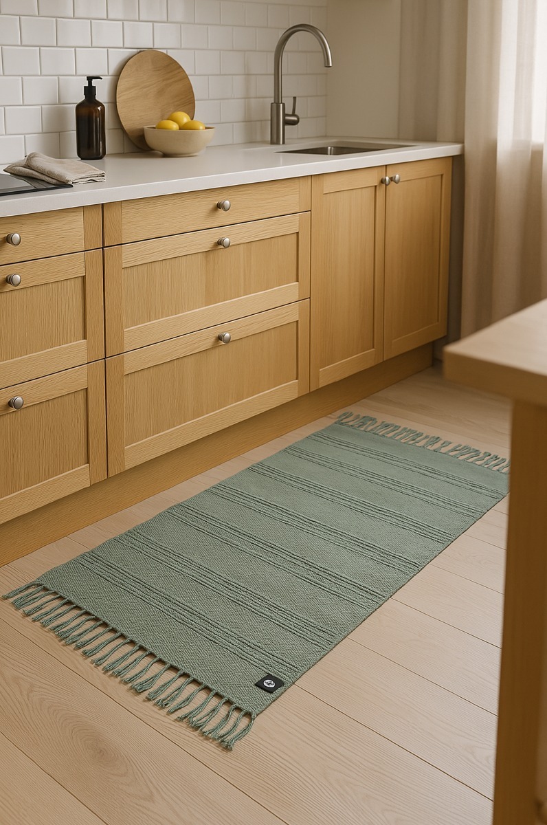 Handvävd grön bomullsmatta med låg lugghöjd som skapar ett lugnt och varmt rum. Enkel att rengöra och perfekt för hall eller sovrum.