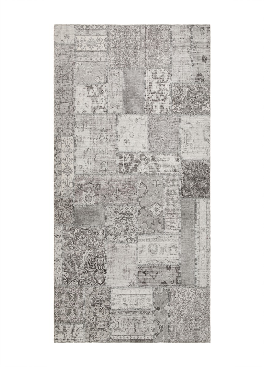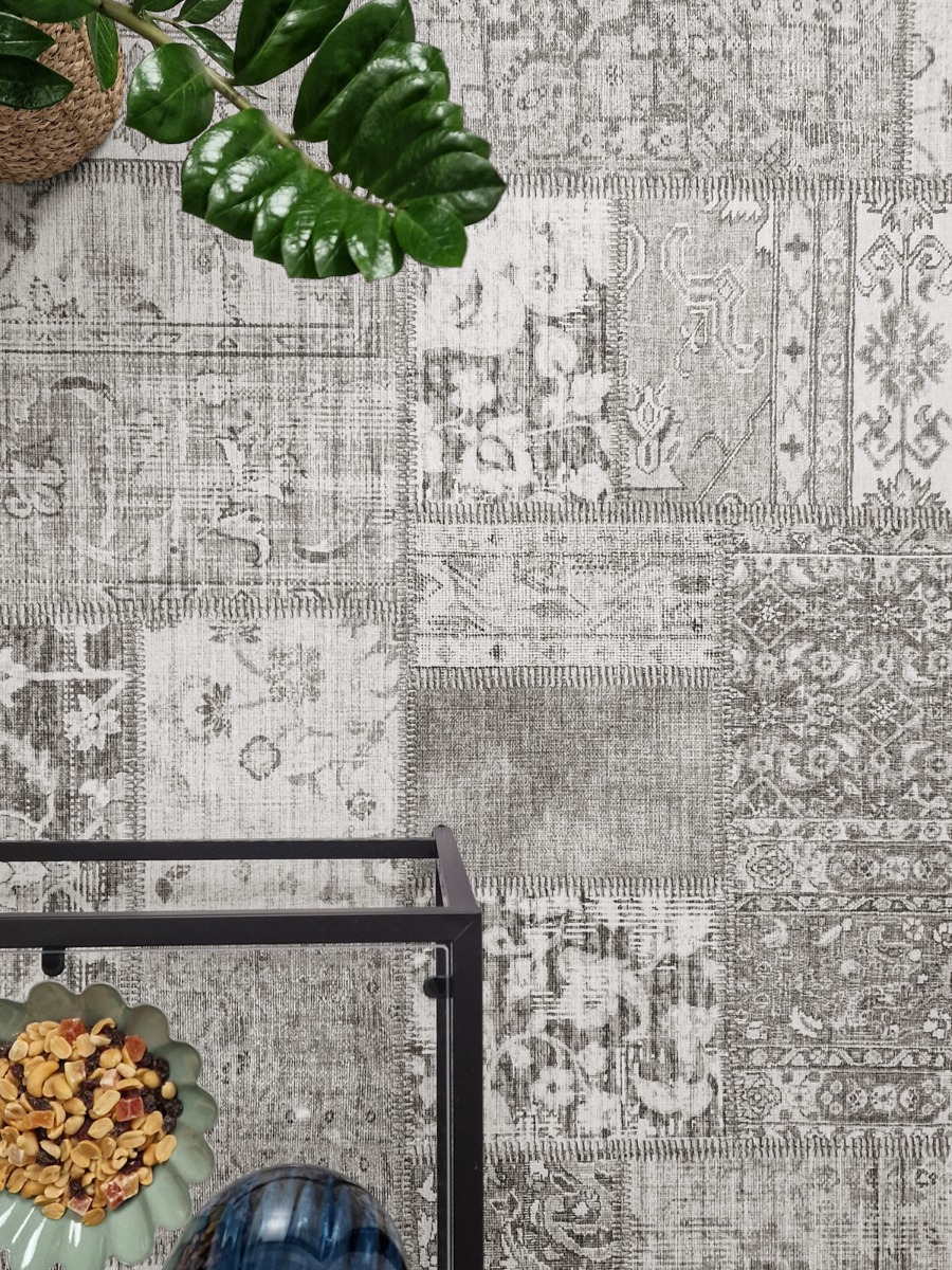 Silverfärgad Wiltonmatta Markiss med unik patchworkdesign i mjuka toner. Mjuk, hållbar och perfekt som gångmatta för att ge ditt rum liv och stil.