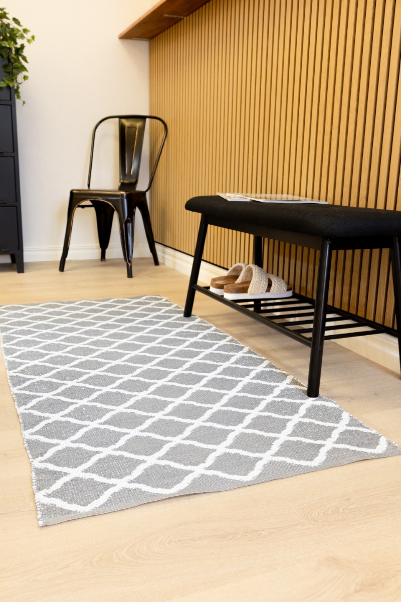 Handvävd grå gångmatta i mjuk och slitstark PVC med vändbar design för dubbla uttryck. Lätt att tvätta och passar alla rum i hemmet.