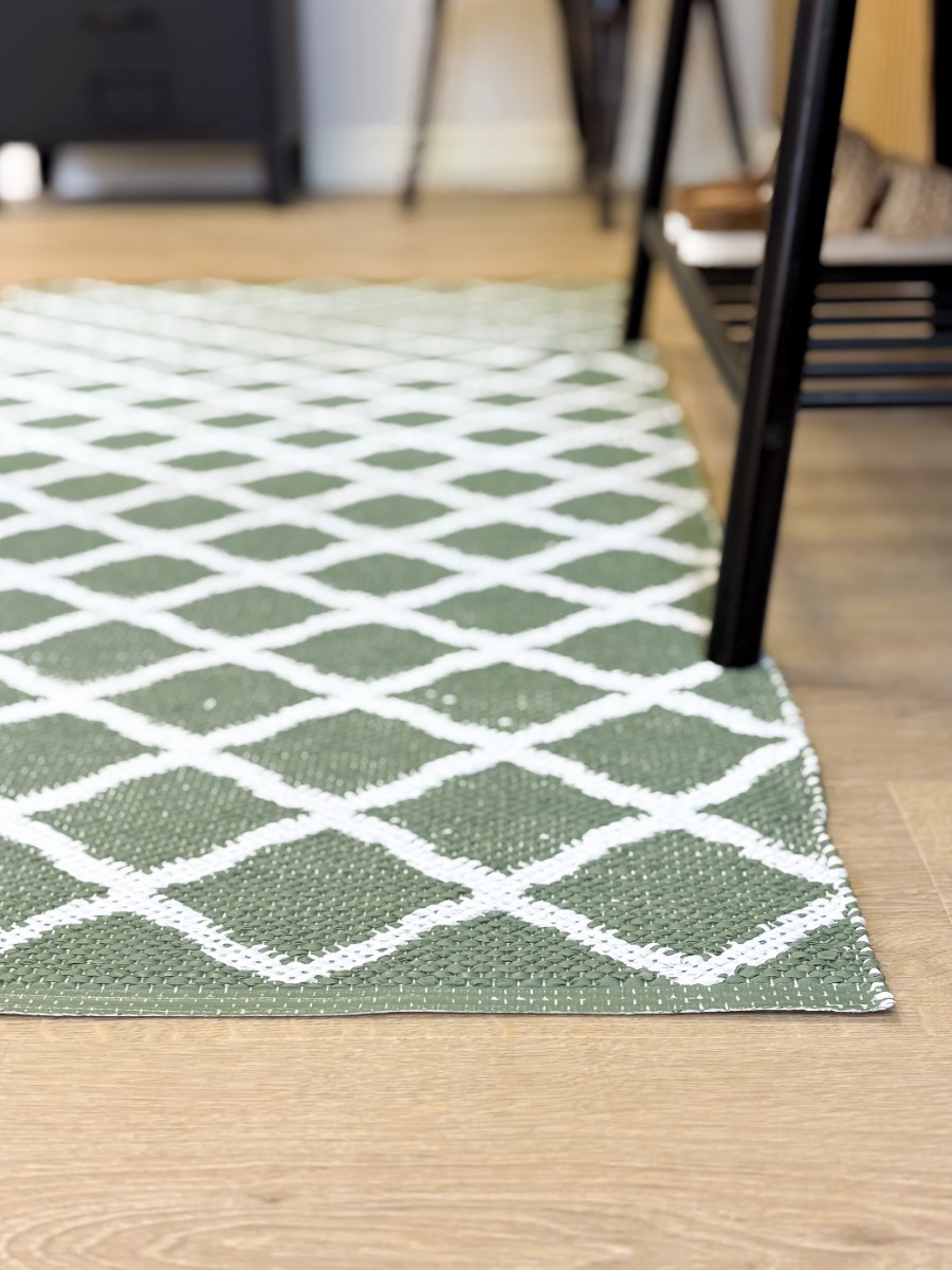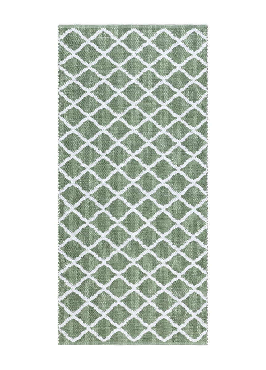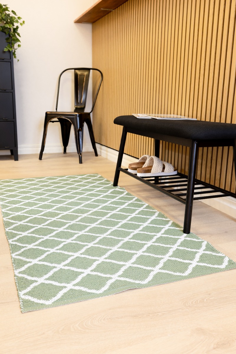 Handvävd grön plastmatta med mjuk och tålig yta. Vändbar design ger dubbel stilvariation och passar perfekt i kök, hall eller uterum.
