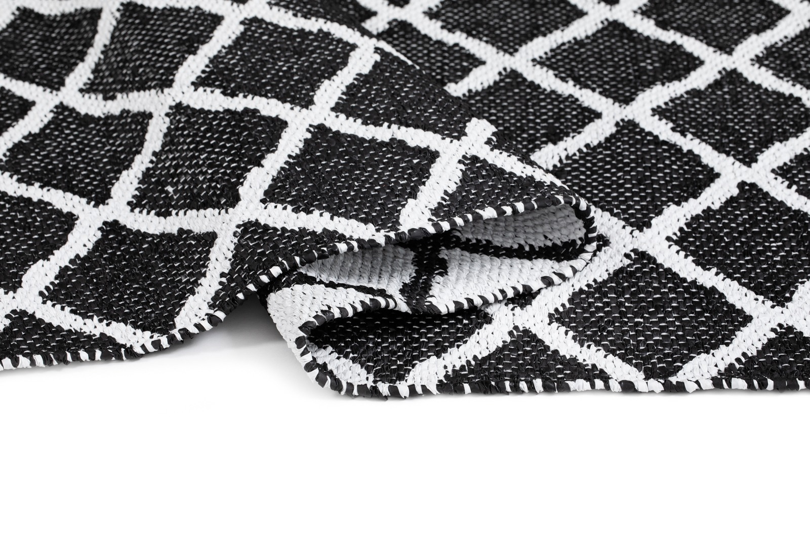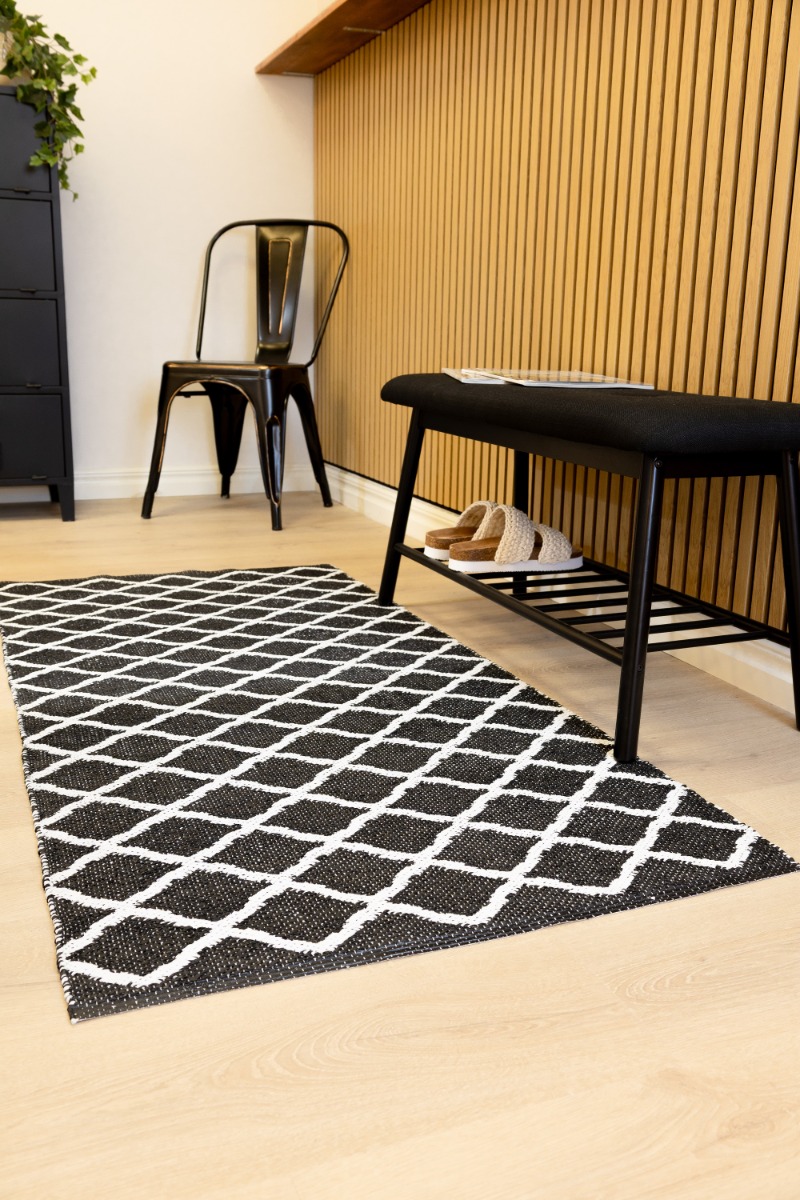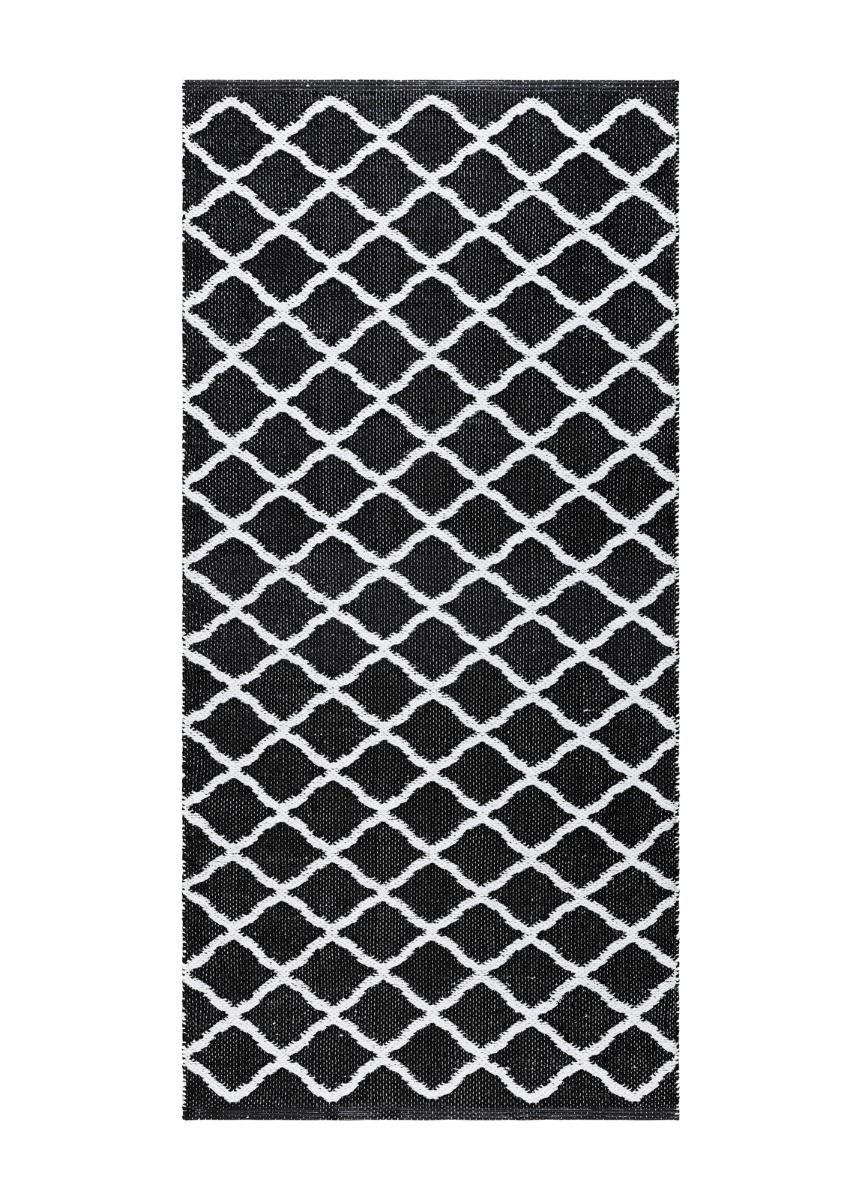 Vändbar plastmatta i tålig PVC med trendig svart design. Mjuk och lättskött gångmatta som passar i alla rum och ger två olika uttryck.