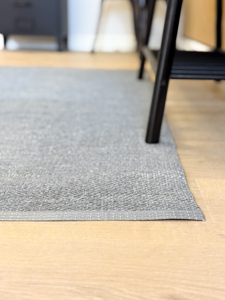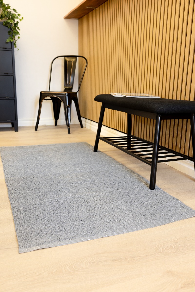 Handvävd vändbar plastmatta i stilren grå nyans. Tålig, mjuk och enkel att rengöra – perfekt för hemmet med högt slitage.