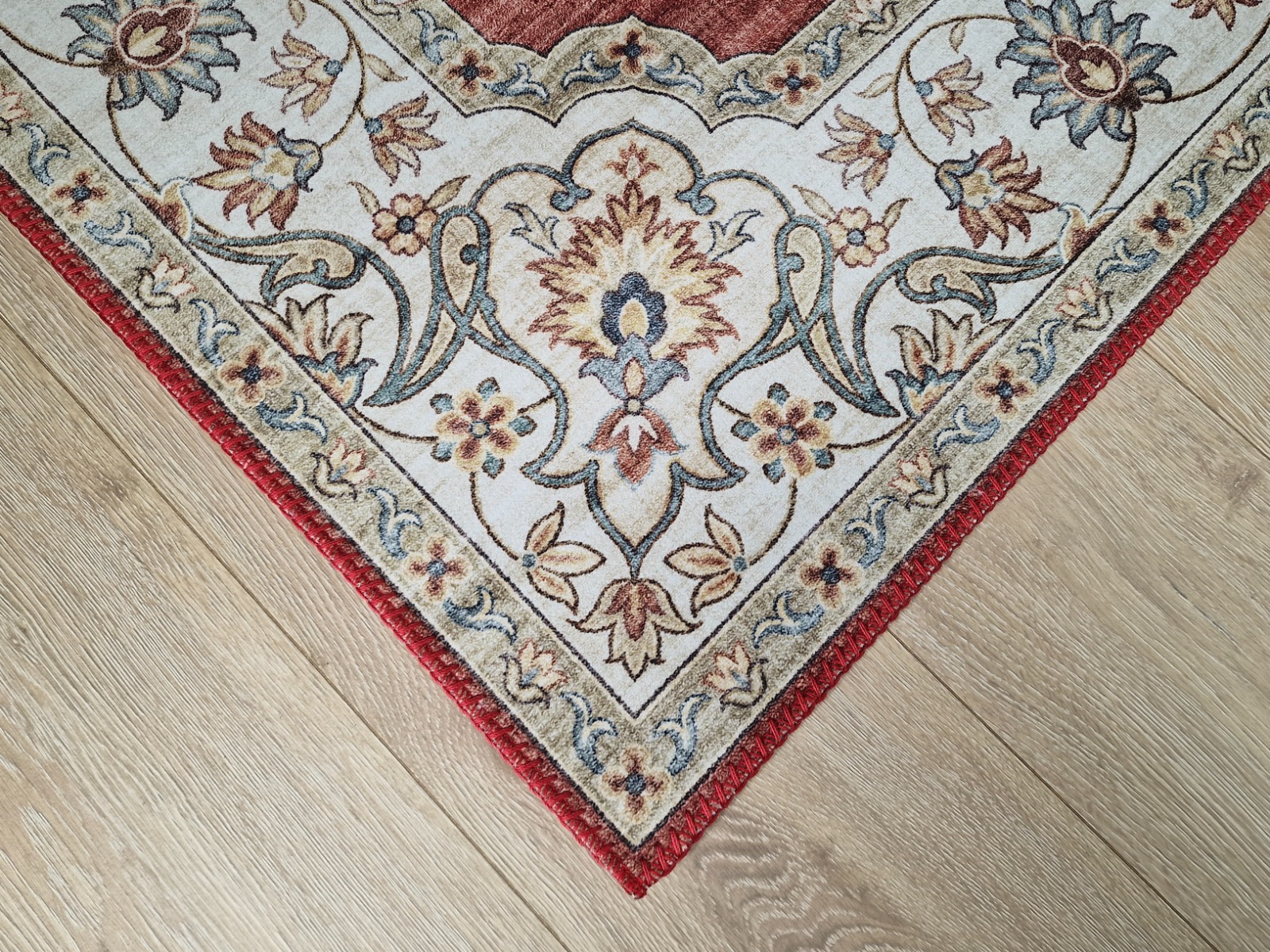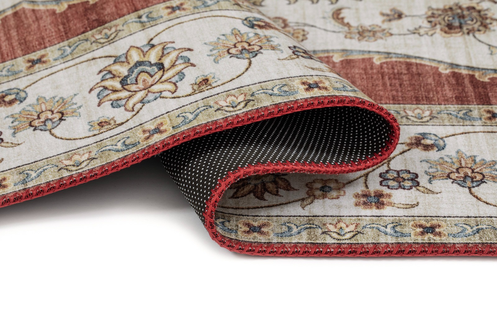 Röd tvättbar gångmatta i 100% polyester med halkskydd och cirka 6 mm tjocklek. Perfekt för hall, kök och vardagsrum som kräver säkerhet och enkel skötsel.