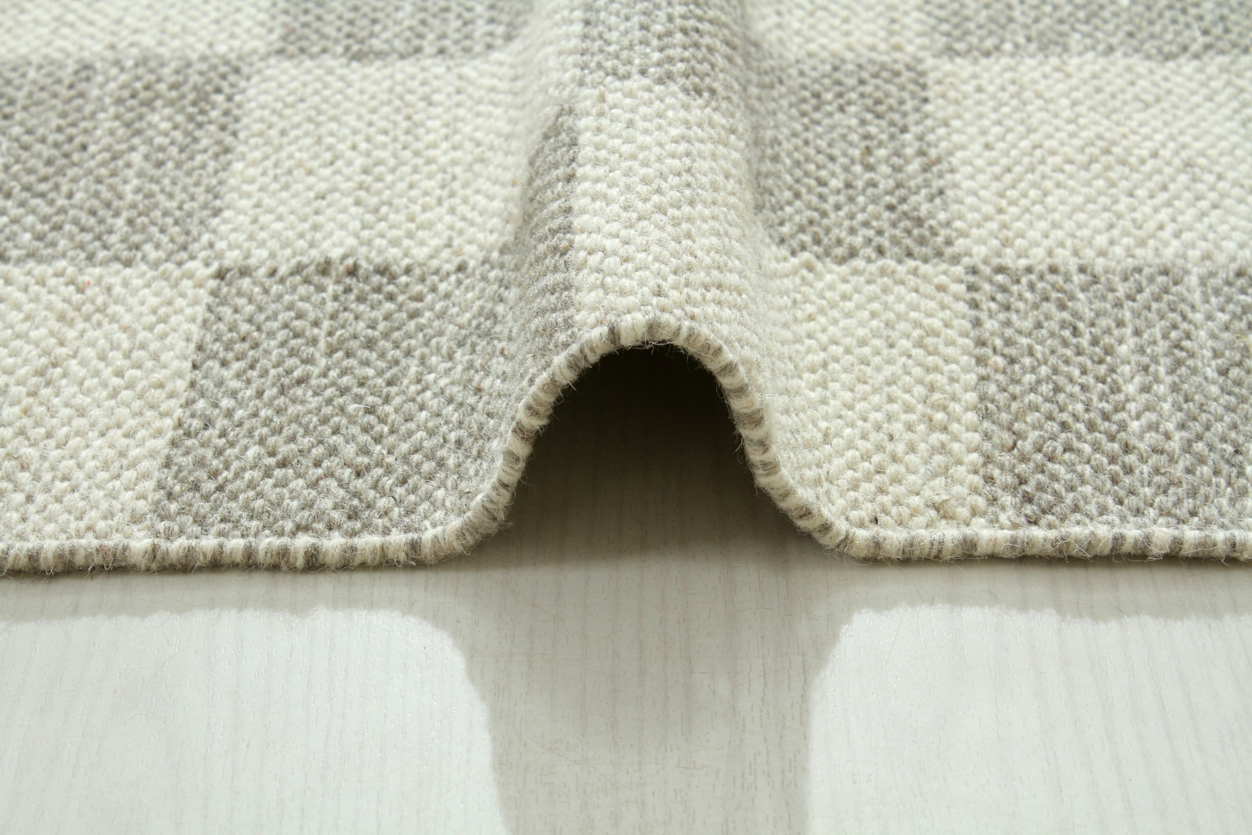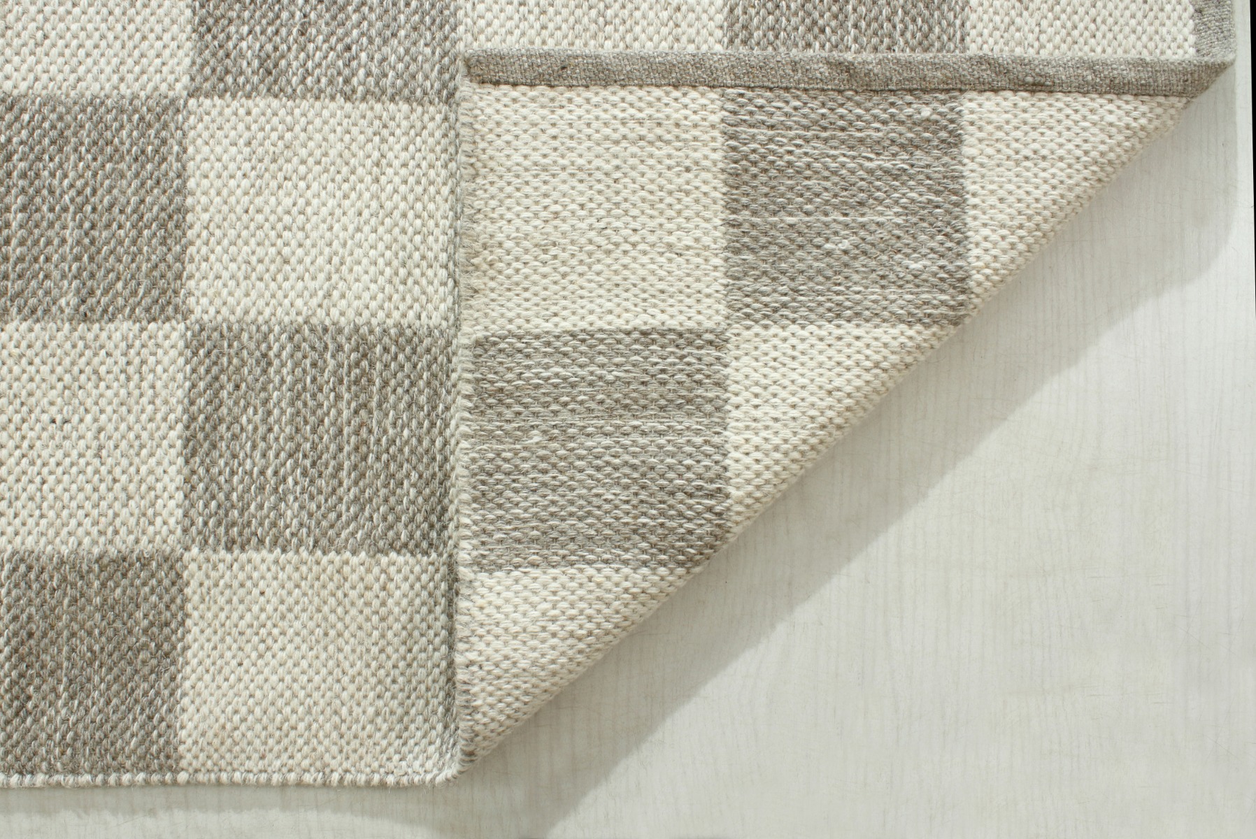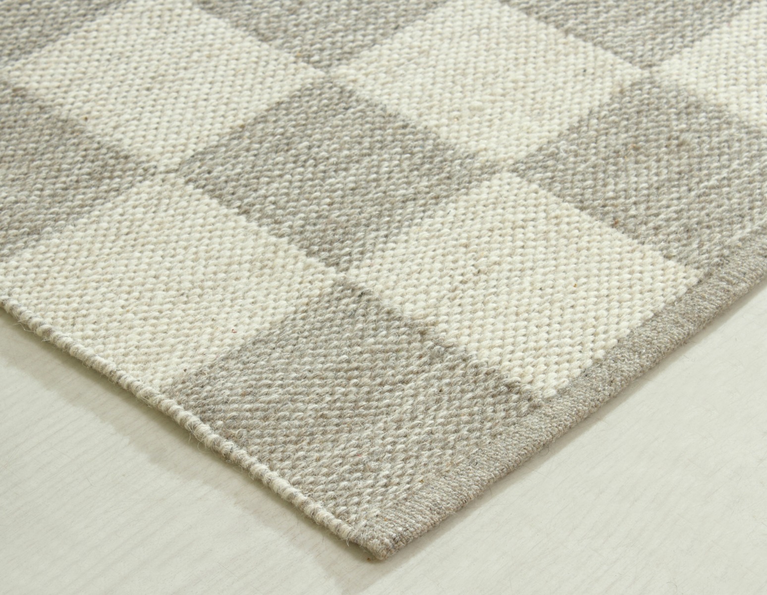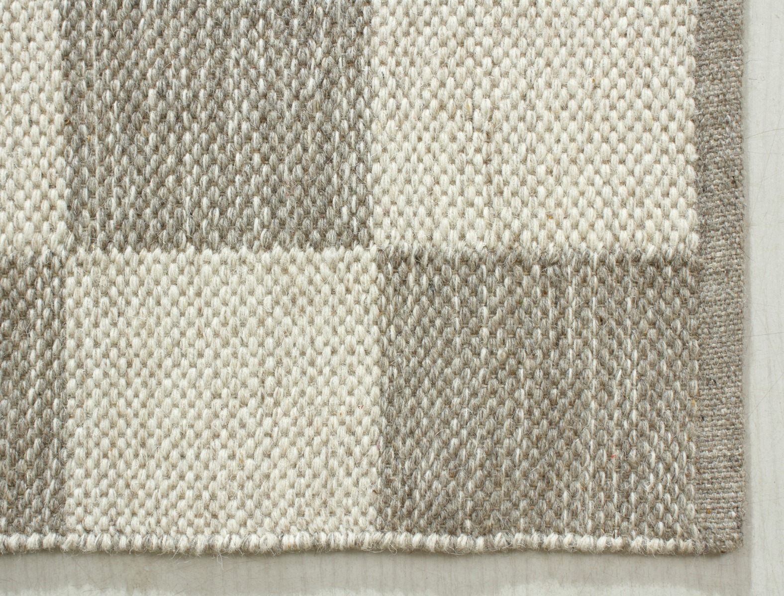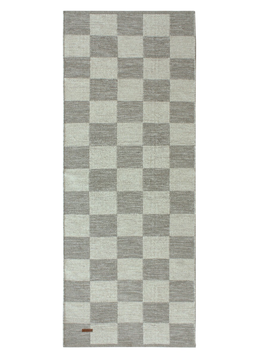 Mjuk och elegant ullmatta i grått med stilrent rutmönster. Enkel att rengöra och perfekt för hall och vardagsrum som vill ha både komfort och design.
