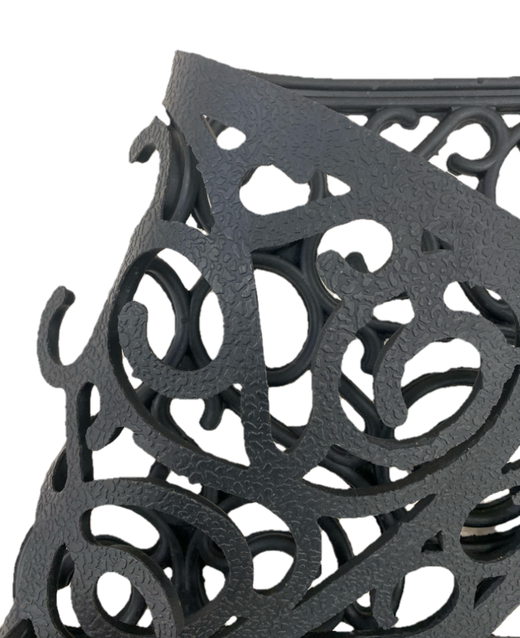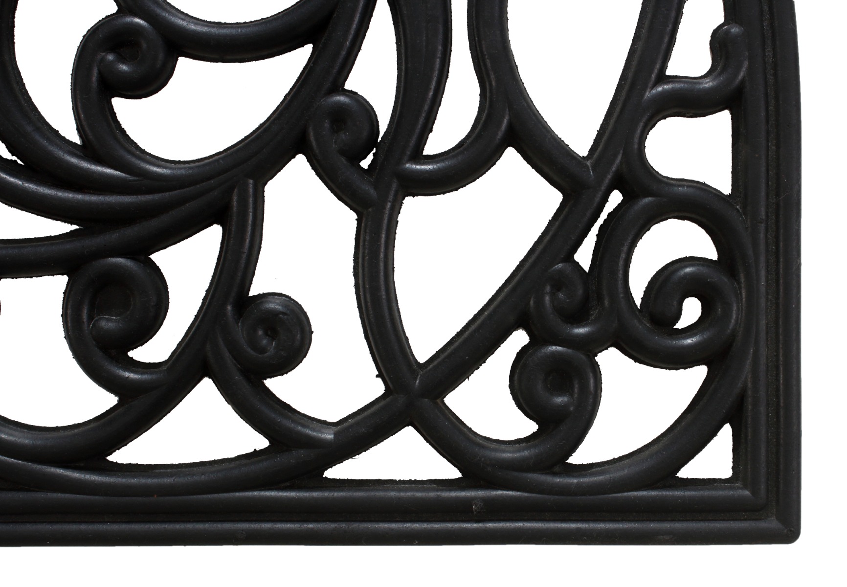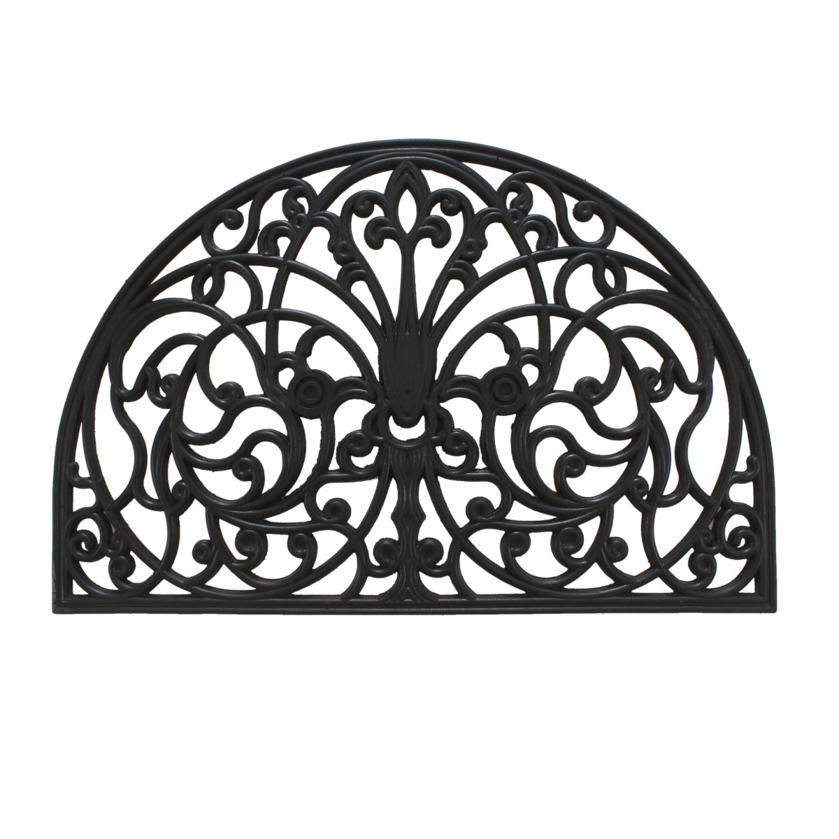 Halvmåneformad svart dörrmatta i slitstarkt syntetmaterial med gjutjärnsstruktur. Effektivt skrapar bort smuts och fukt, perfekt för hem och kontor.