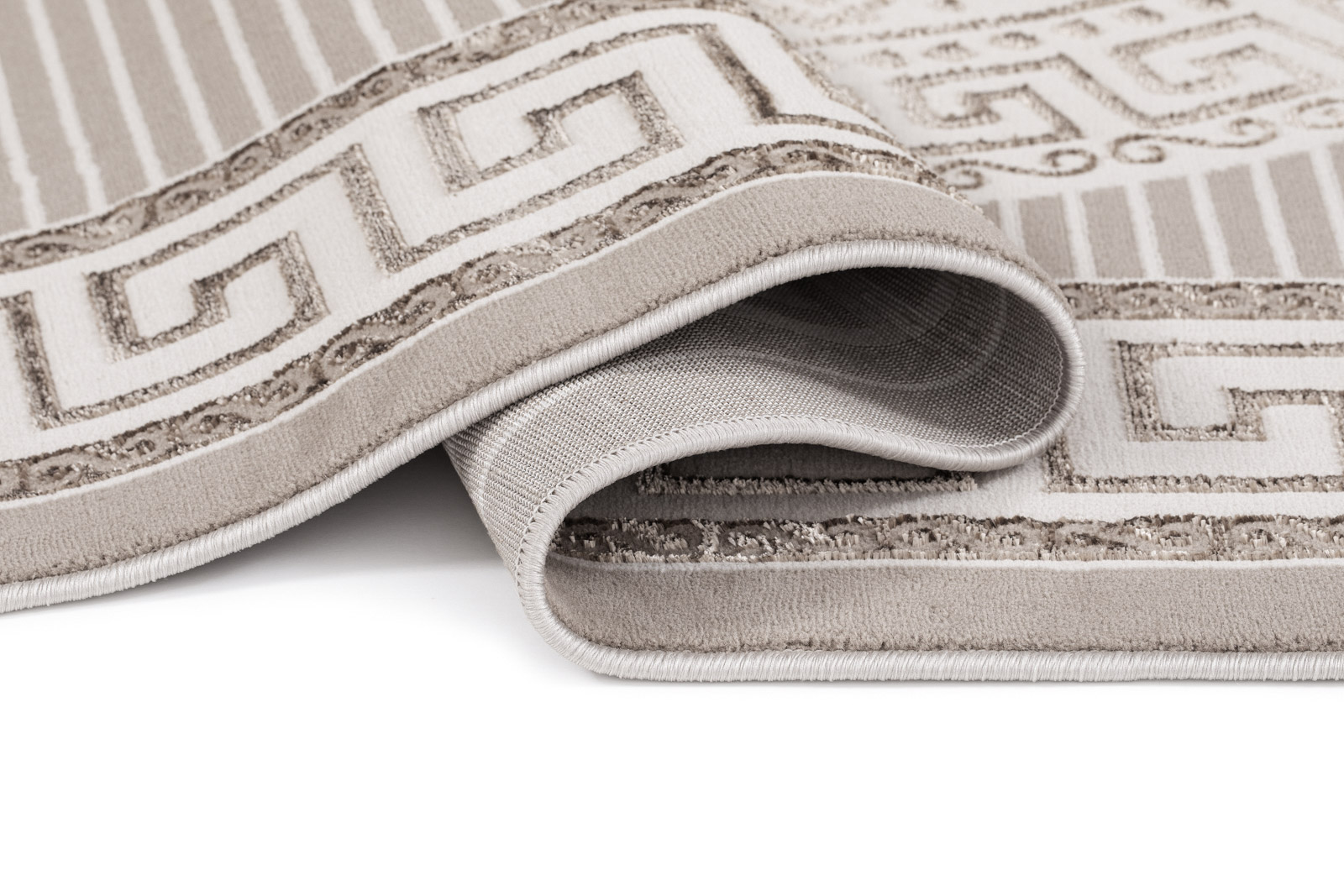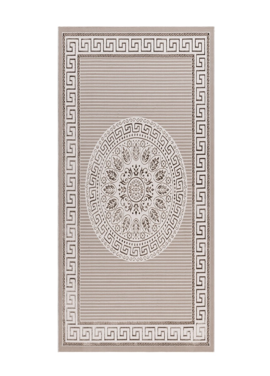 Elegant gångmatta i tålig polyester med modern taupe och kopparfärg. Låg lugg för enkel rengöring och fläckbeständig, perfekt för hemmets alla rum.