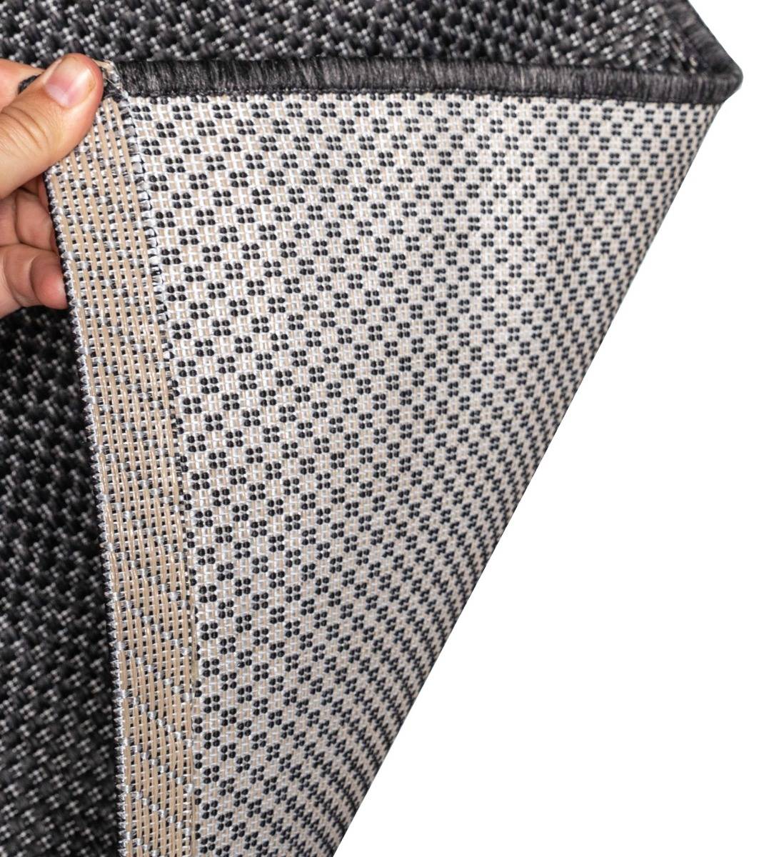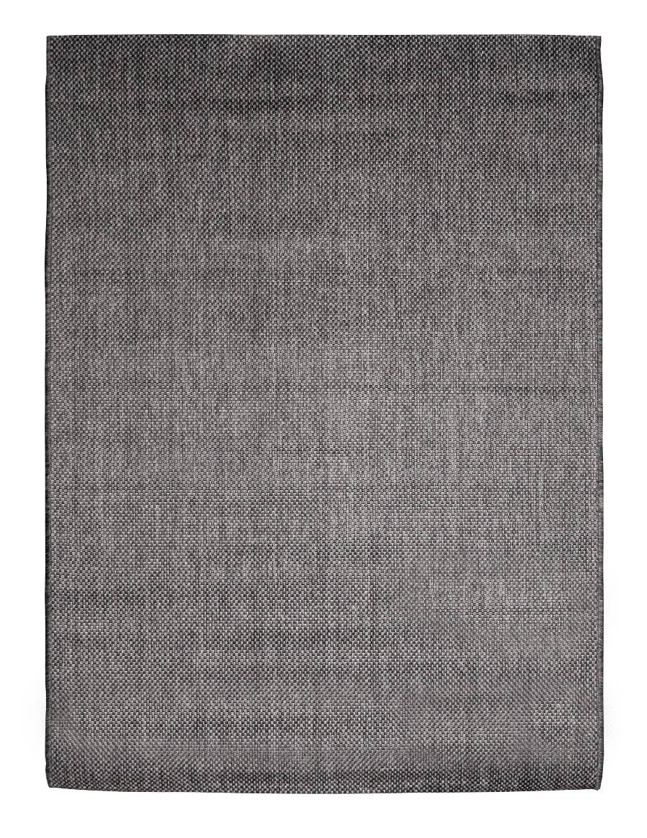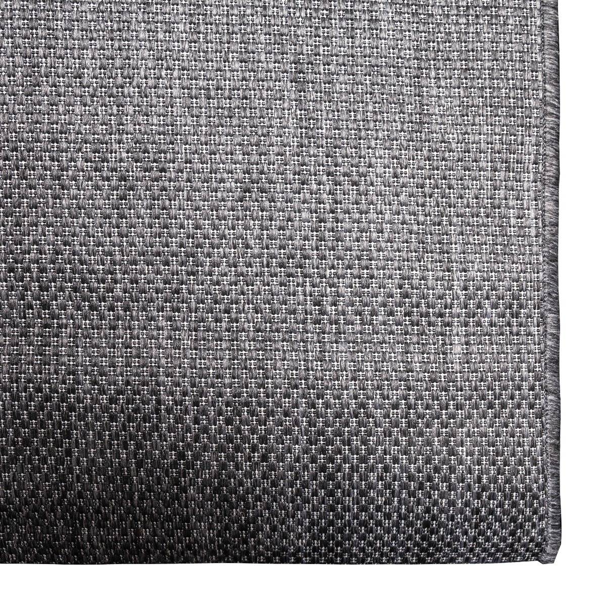 Slitstark och tunn mörkgrå flätvävd matta för både inomhus- och utomhusbruk. Lätt att rengöra och stilren i alla moderna hem.