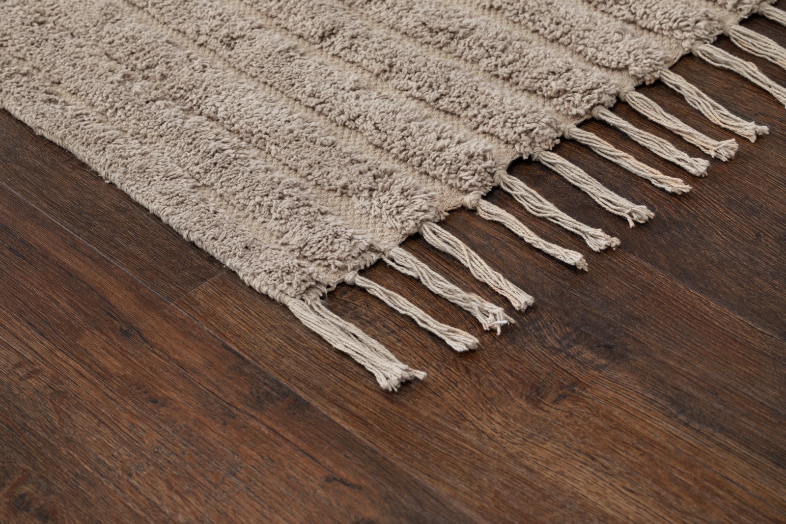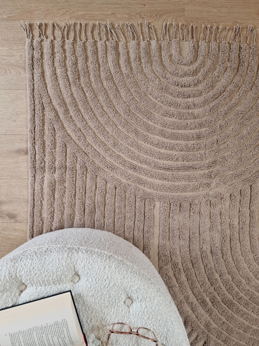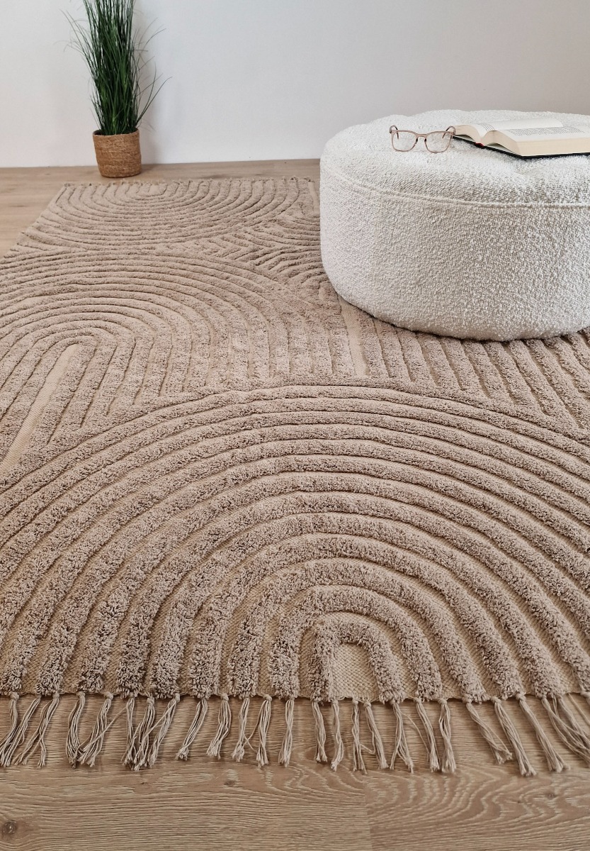 Handvävd bomullsmatta i linnefärg med unik vågmönstrad yta och dekorativa fransar. Slitstark och mjuk under foten – perfekt för hemets alla rum.