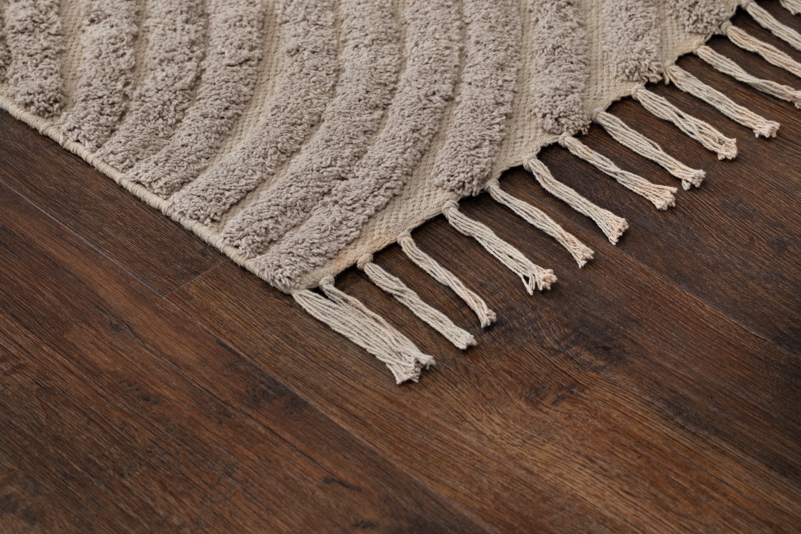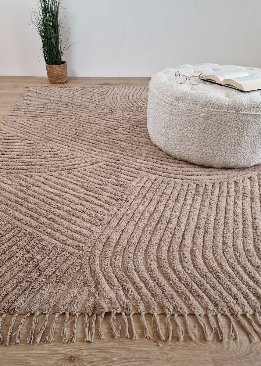 Handvävd bomullsmatta i varm linnefärg med unikt vågmönster och dekorativa fransar. Slitstark, mjuk och perfekt för att skapa en ombonad känsla i ditt hem.