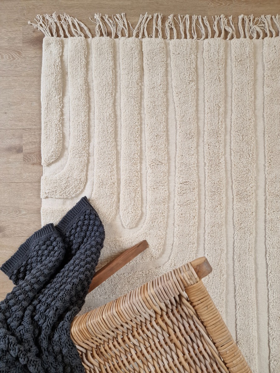 Juno är en handvävd krämfärgad bomullsmatta med ett unikt vågmönster och mjuka fransar. Perfekt för att skapa en varm och inbjudande känsla i alla rum.