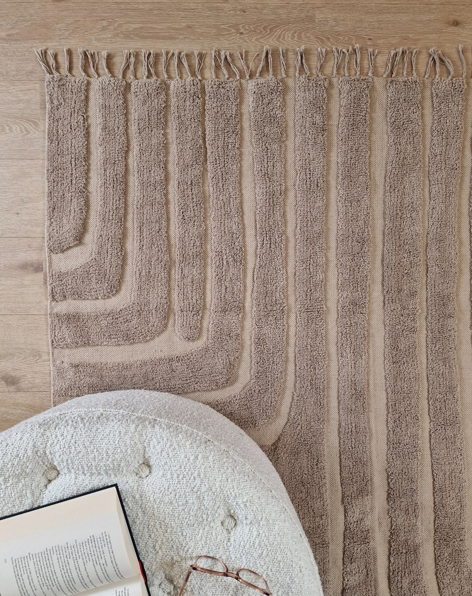 Handvävd bomullsmatta i linnefärg med elegant vågmönster och mjuk textur. Perfekt för att skapa värme och komfort i ditt hem.