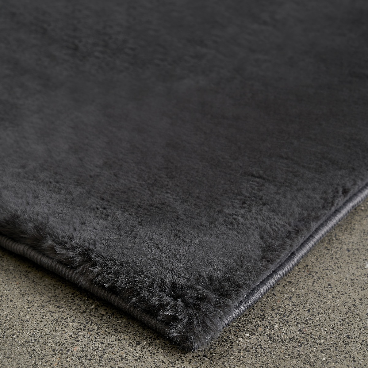 Mjukt och slitstarkt mörkgrå plyschmatta i 100% polyester med 30 mm tjocklek. Allergivänlig, lättskött och perfekt för att skapa en varm och elegant inredning.