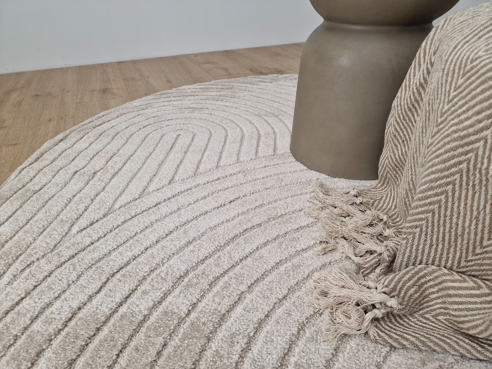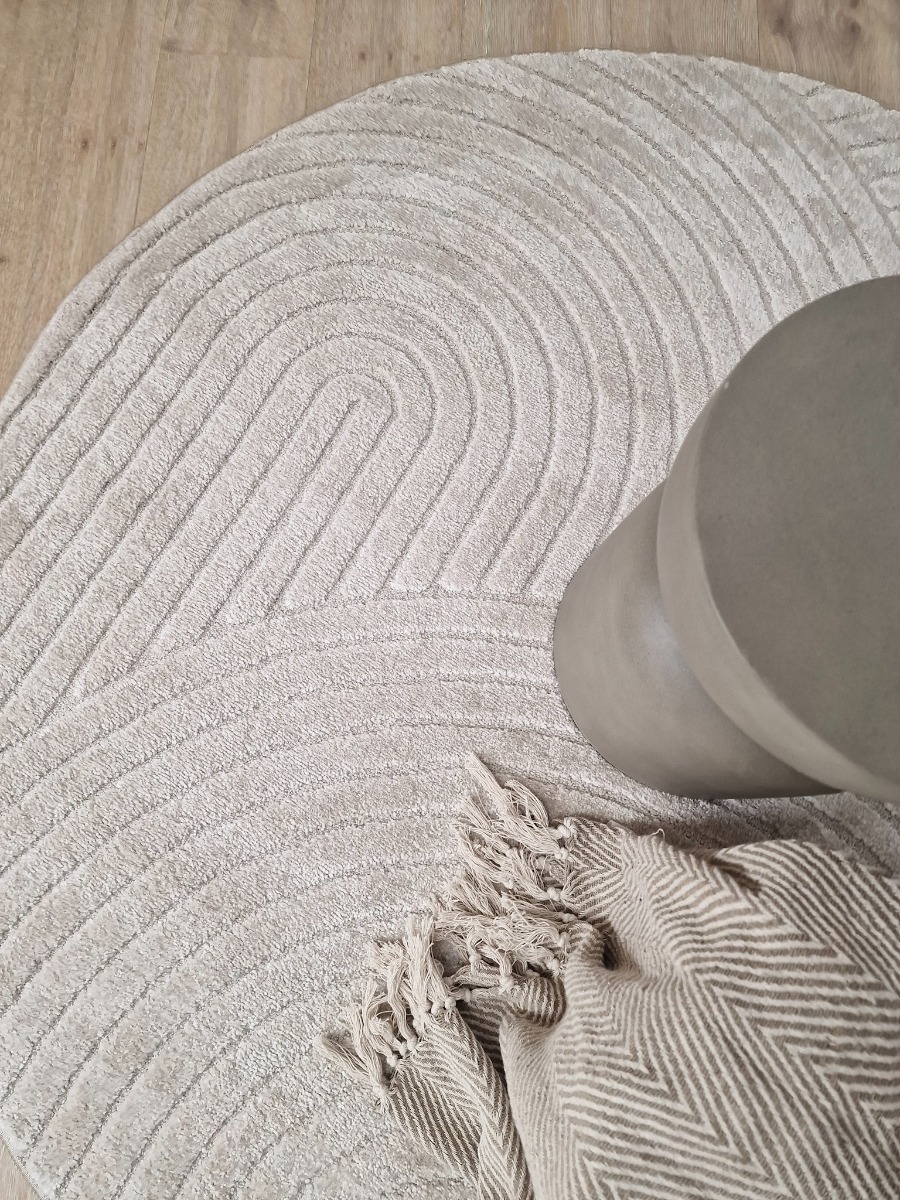 Elegant rund Wiltonmatta i linnefärg med high/low-effekt som skapar djup och en mjuk, inbjudande känsla. Perfekt för att lyfta vilken rumsmiljö som helst.