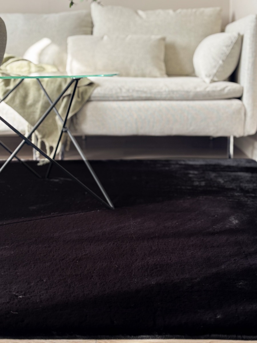 Lyxig svart pälsmatta med silkeslen mikrofiber och tjock lugg. Ger värme, komfort och elegant stil till ditt hem nu.