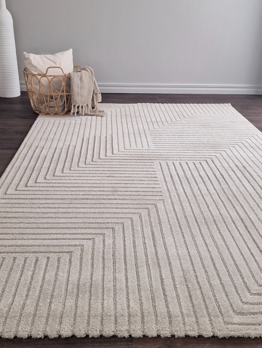 Modern matta Tesina i linnefärg ger ditt rum en mjuk, naturlig känsla med slitstark jutevävbaksida och säker design. Passar perfekt i vardagsrum och sovrum.