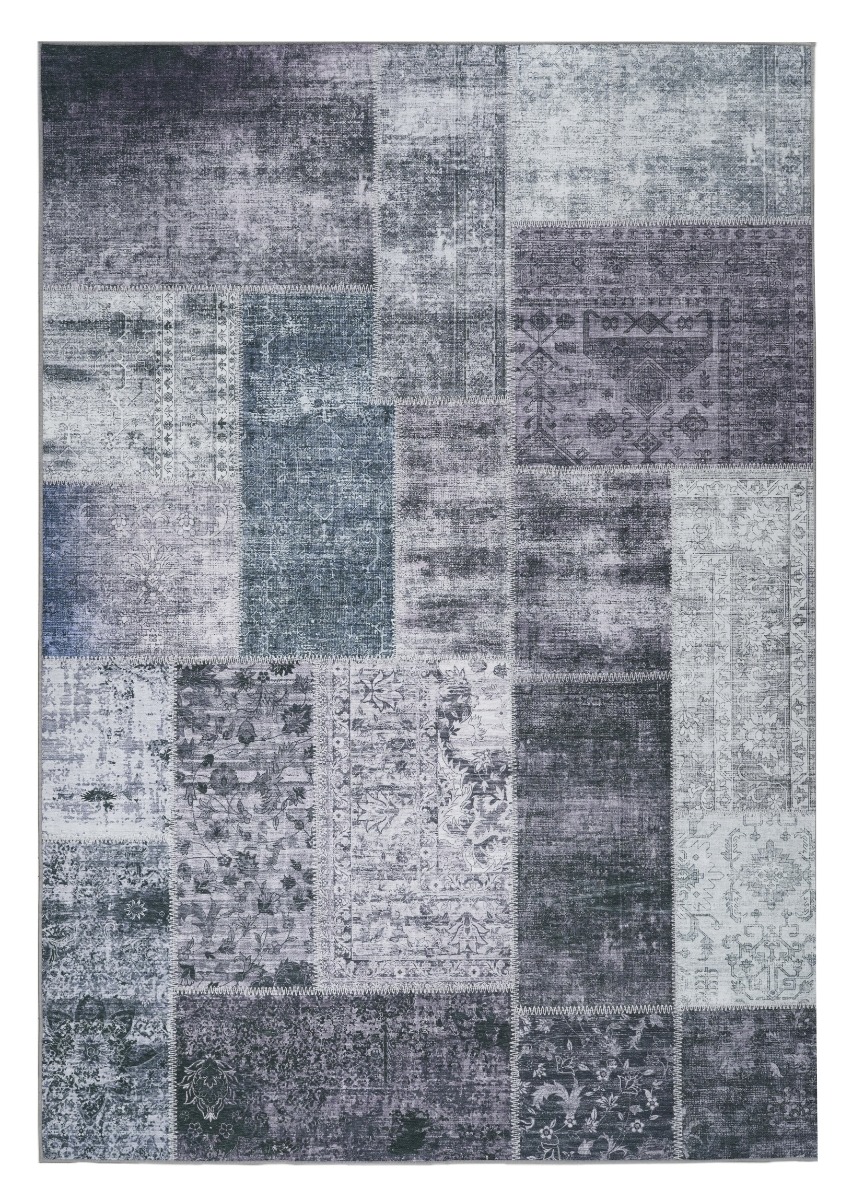 Stilren grå patchwork matta i mjuk polyester med cirka 10 mm tjocklek. En hållbar och lättskött matta som skapar värme och komfort i ditt hem.