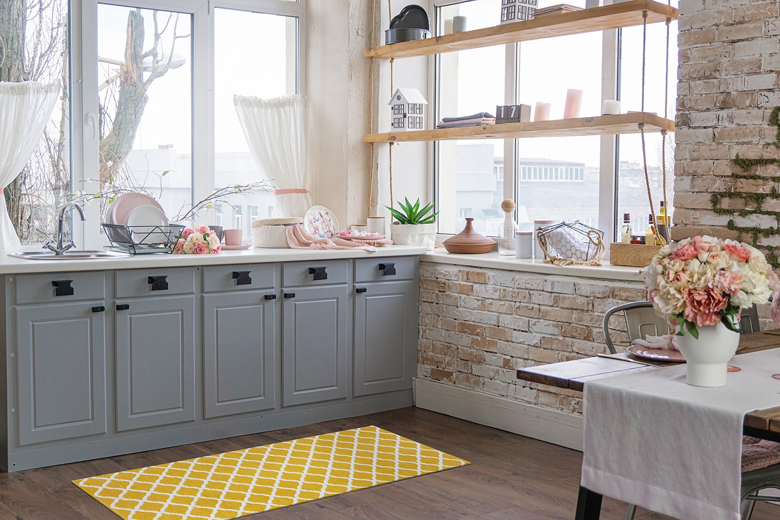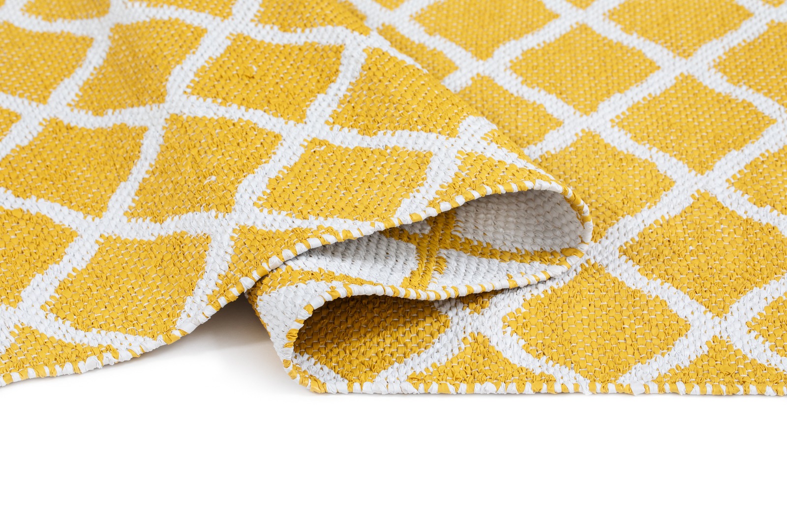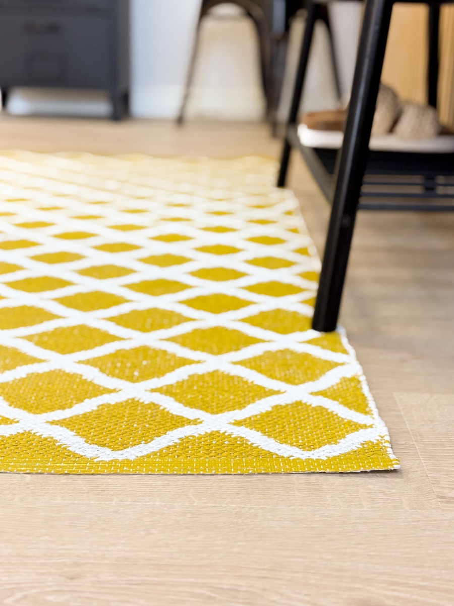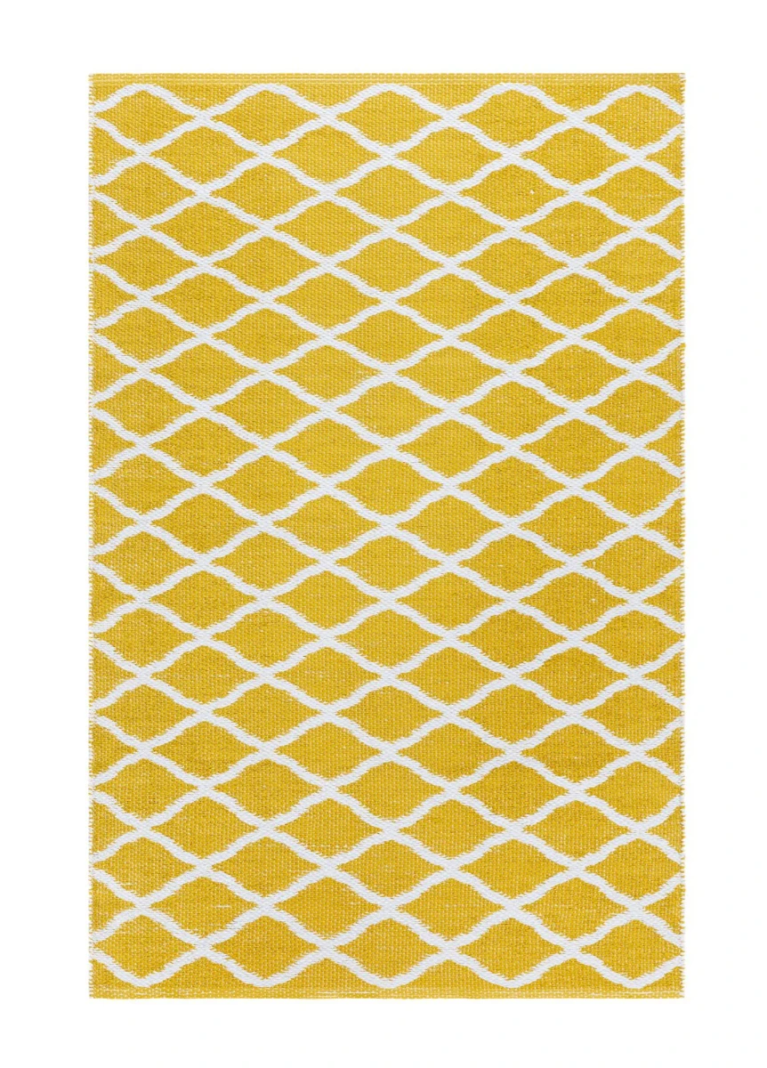 Handvävd plastmatta i mjuk PVC med vändbart mönster och livfull gul nyans. Slitstark och lättskött för hall, kök eller vardagsrum.