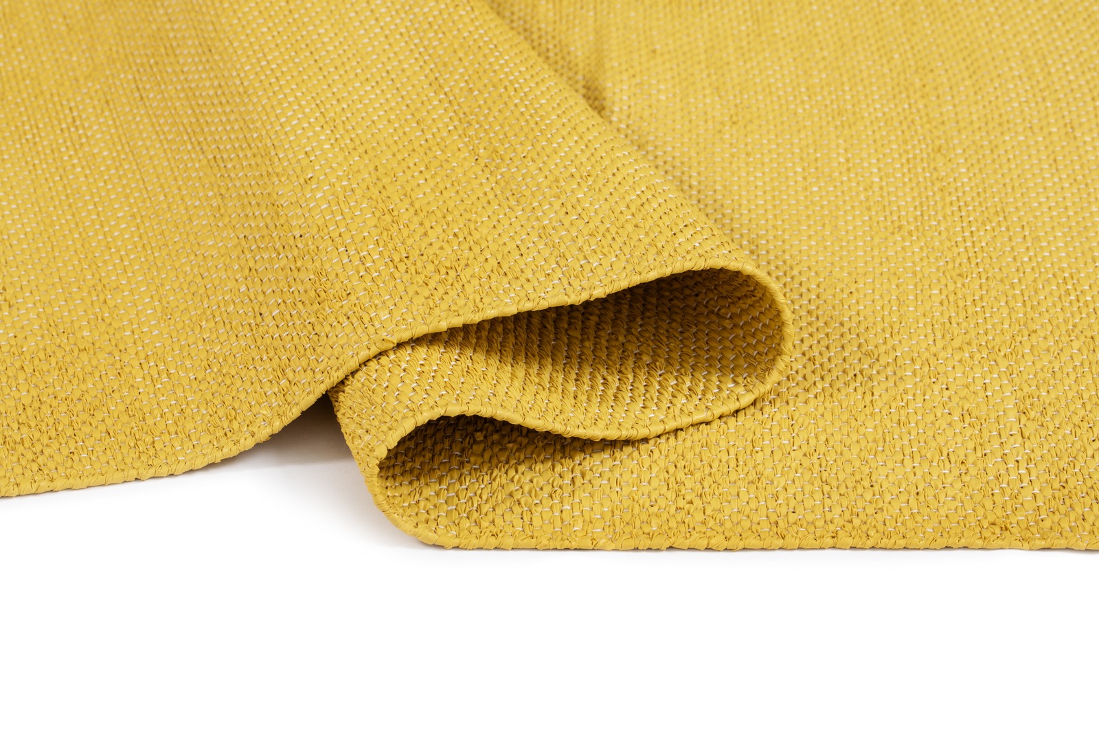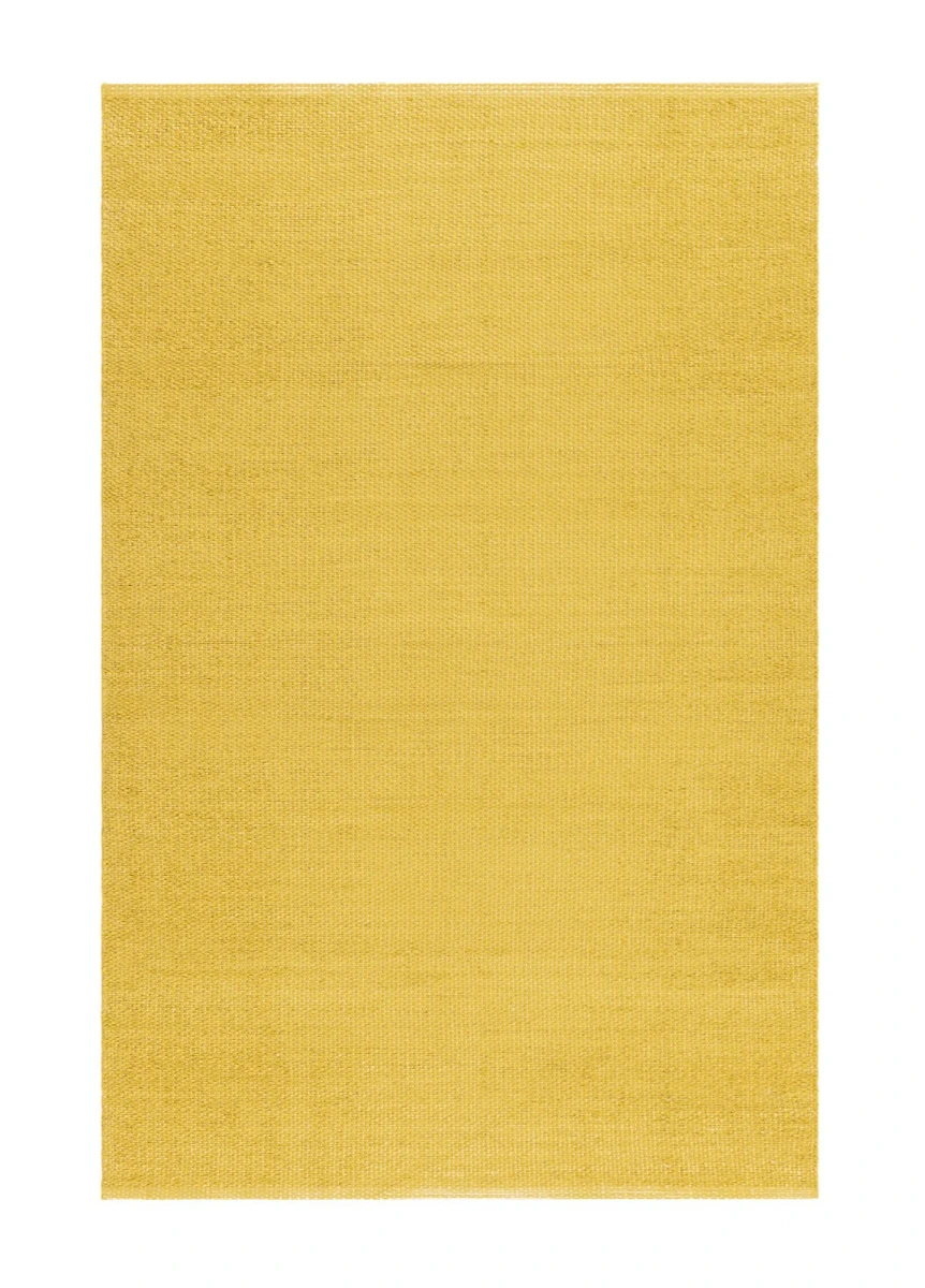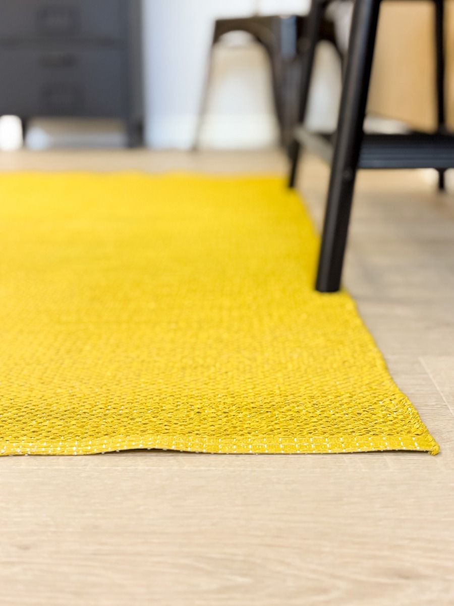 Handvävd plastmatta i energigivande gult med mjuk bomullsvarp. Slitstark, vändbar och enkel att tvätta – perfekt för kök och hall.