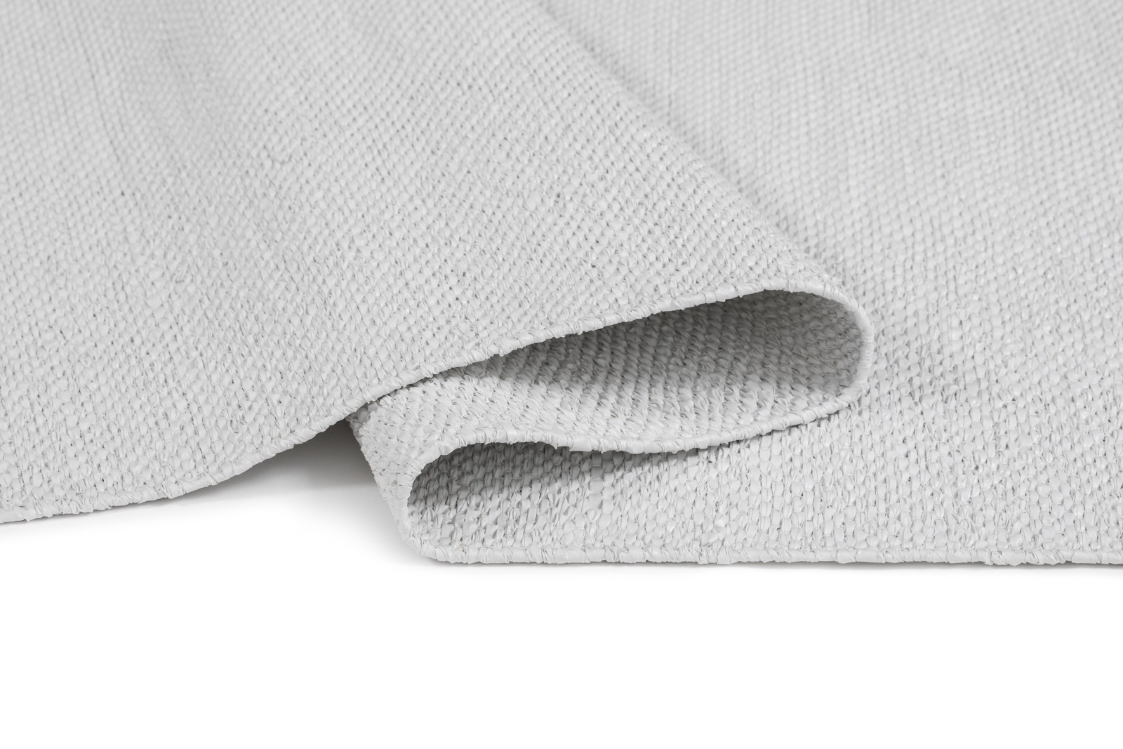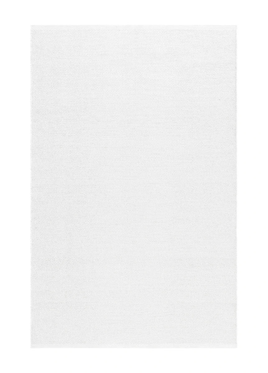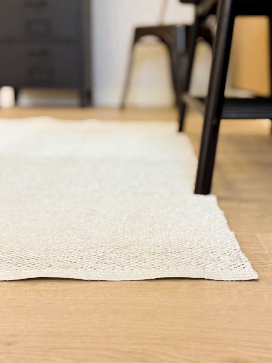 Vit handvävd plastmatta i mjuk PVC med vändbart mönster. Lättskött och slitstark, passar perfekt i kök, hall eller vardagsrum för en fräsch och modern stil.