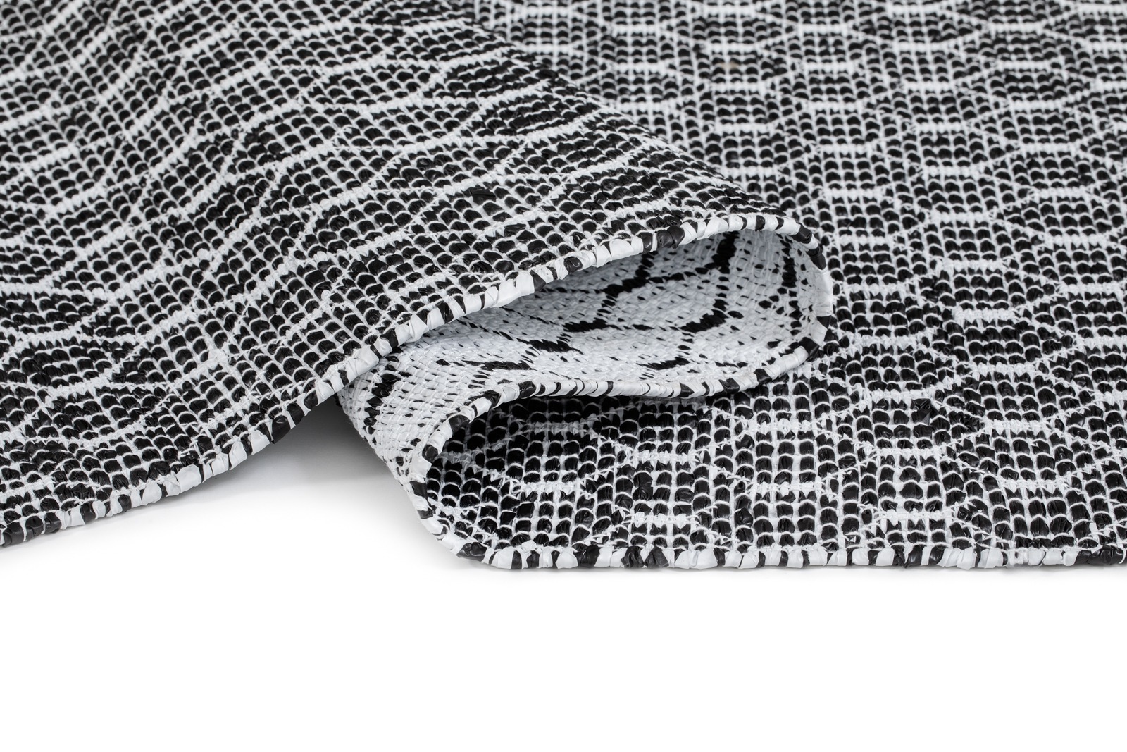 Handvävd svart plastmatta med dubbel design och hög hållbarhet. Enkel att vända och rengöra – perfekt för alla rum i hemmet.