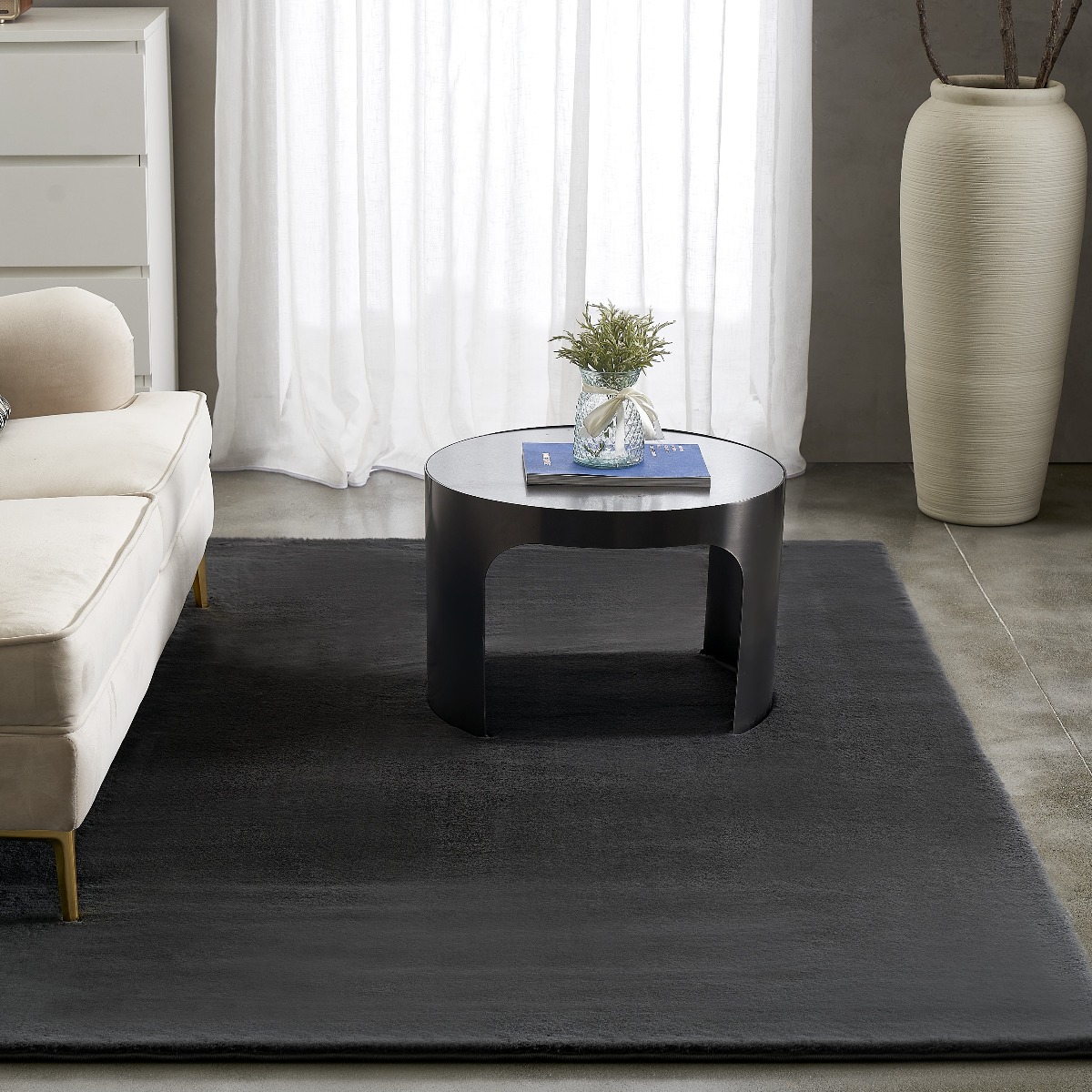 Mjukt och tåligt fluffmaterial i mörkgrått som skapar värme och komfort. En tvättbar pälsmatta som förvandlar ditt rum med mysig elegans.