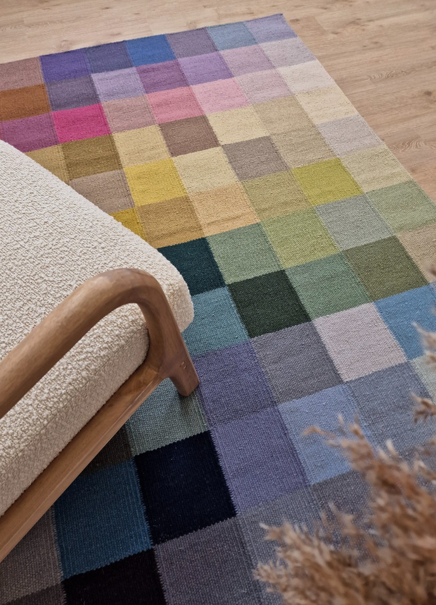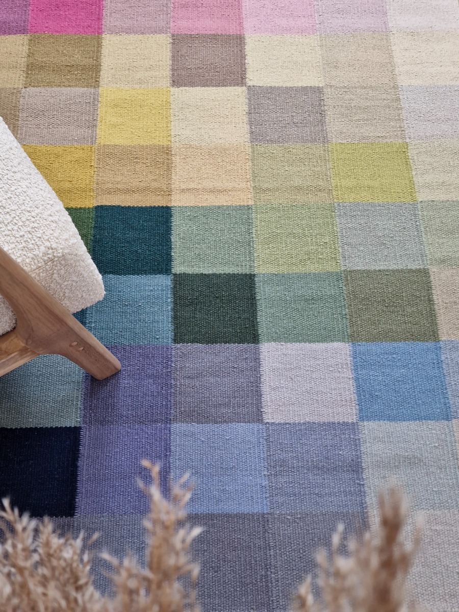 Handvävd ullmatta med multifärgat mönster som tillför värme och stil. Dubbelanvändbar och slitstark för vardaglig elegans i hemmet.