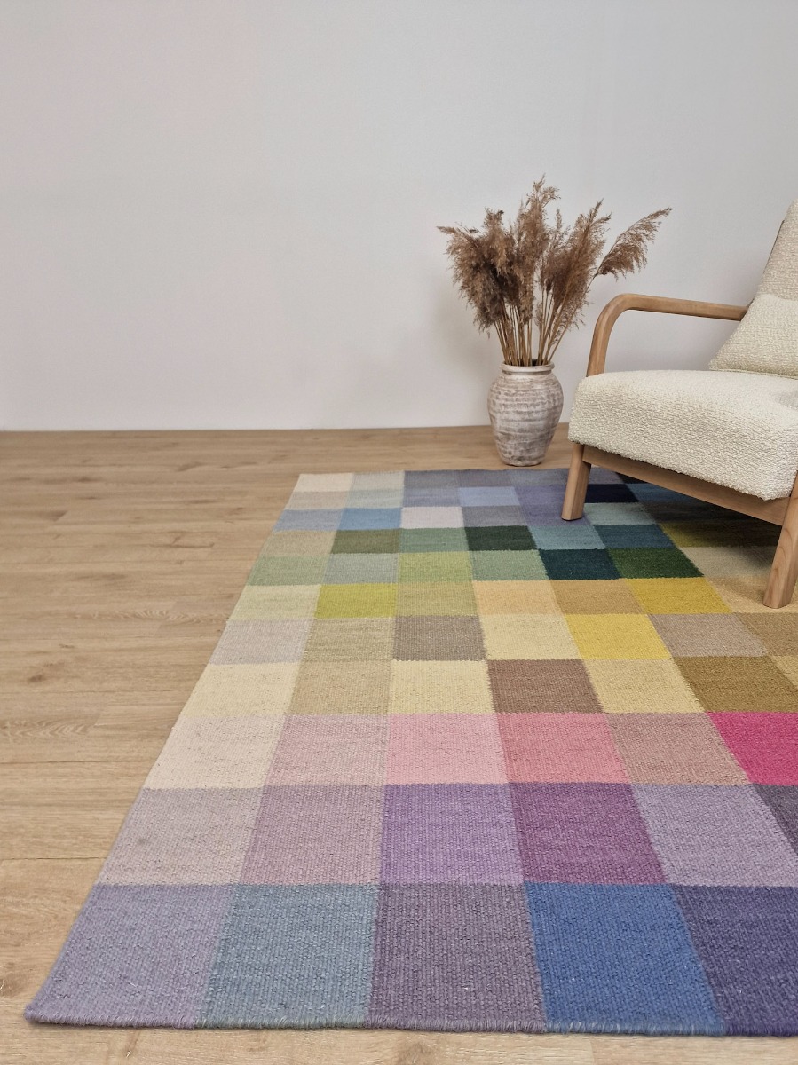 Handvävd ullmatta med flerfärgad design som tillför värme och hållbar elegans till ditt hem. Slitstark och lättskött med dubbelsidig användning.