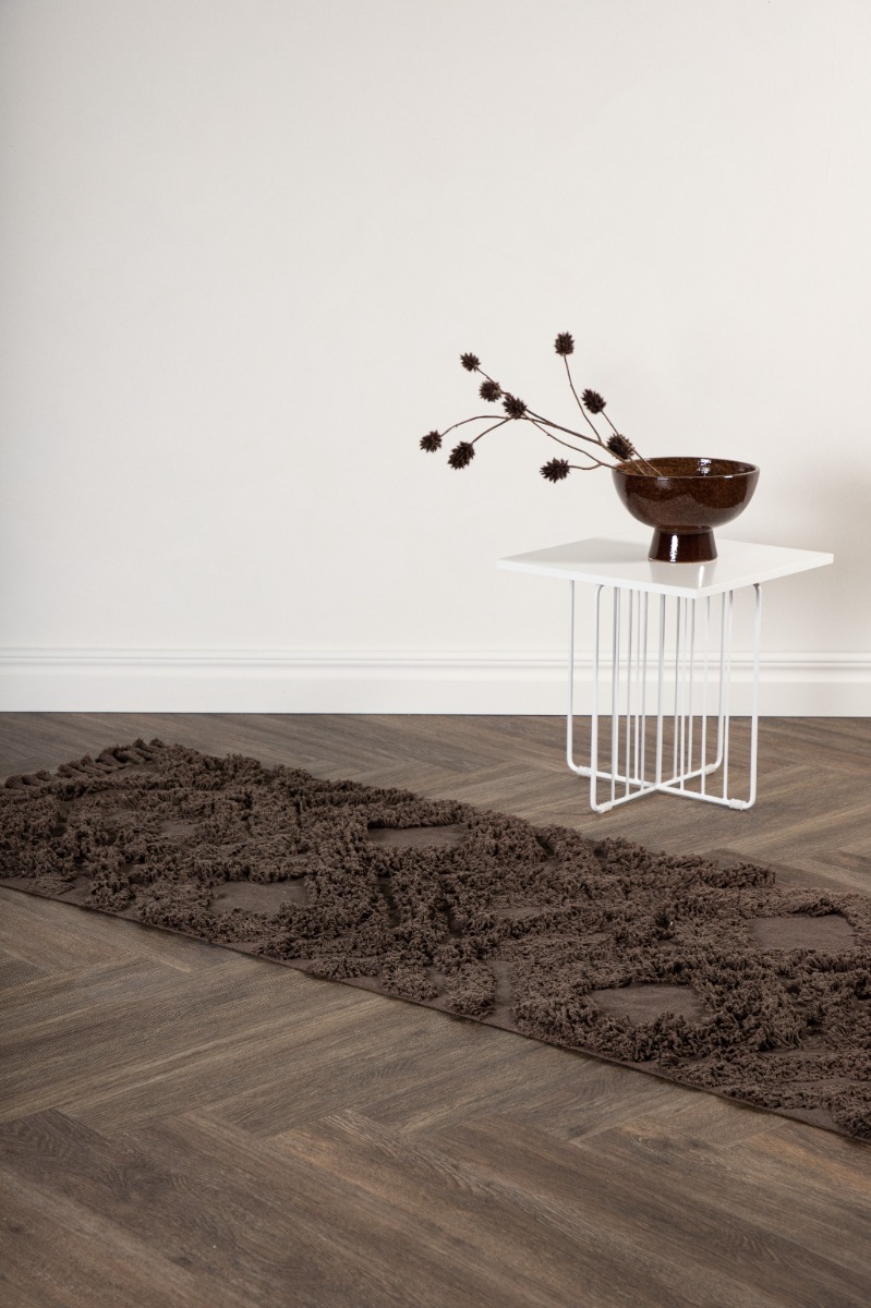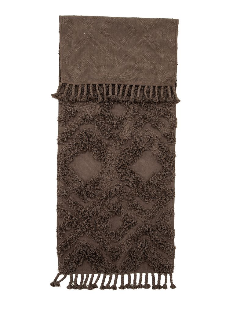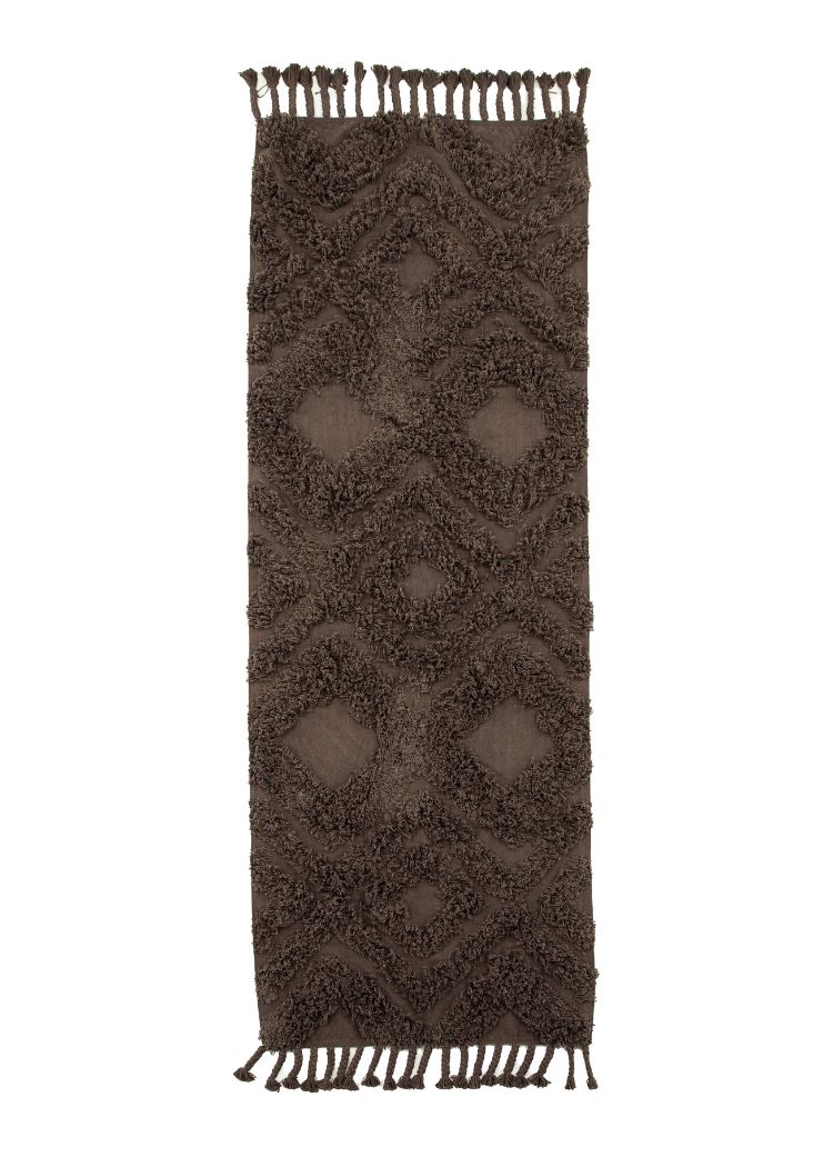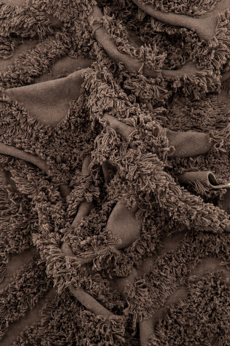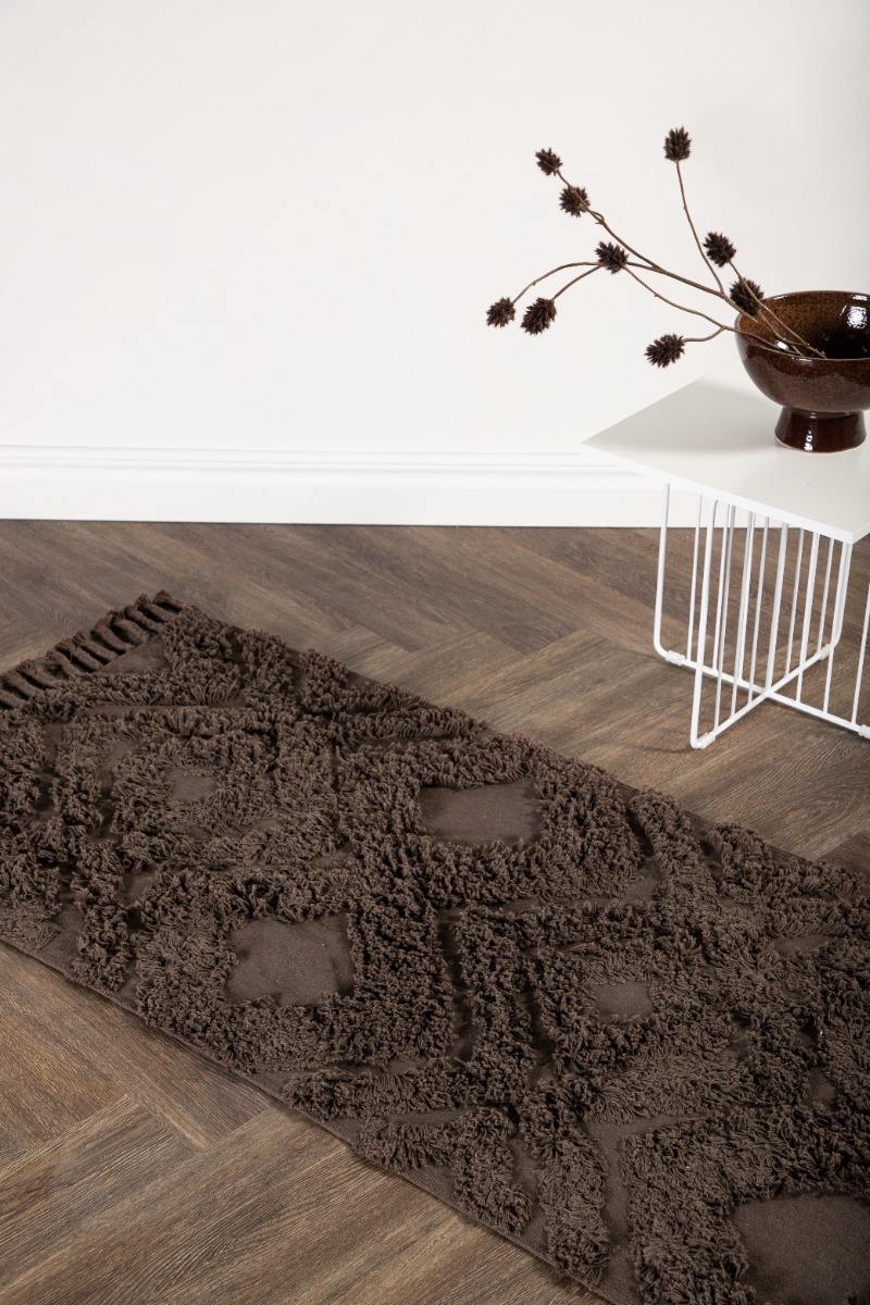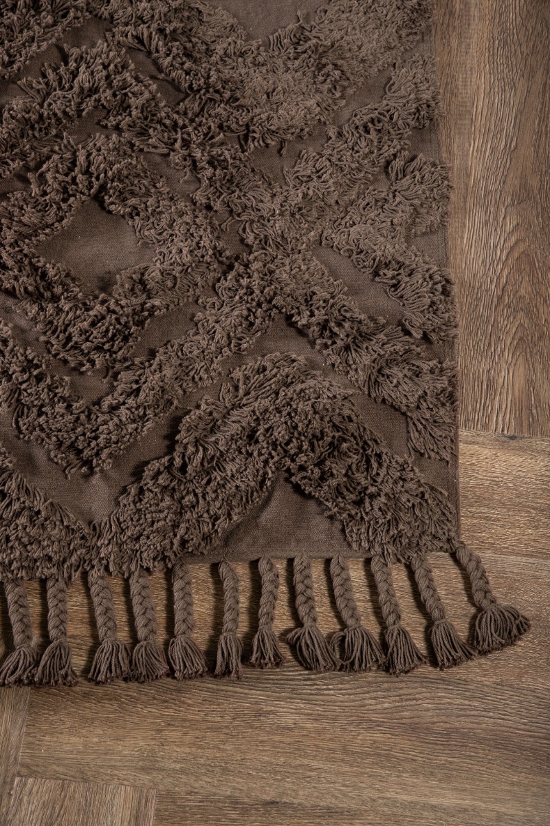 Mjuk brun bomullsmatta med fluffig yta och dekorativa fransar. Perfekt för att skapa värme och stil i hall, sovrum eller vardagsrum.