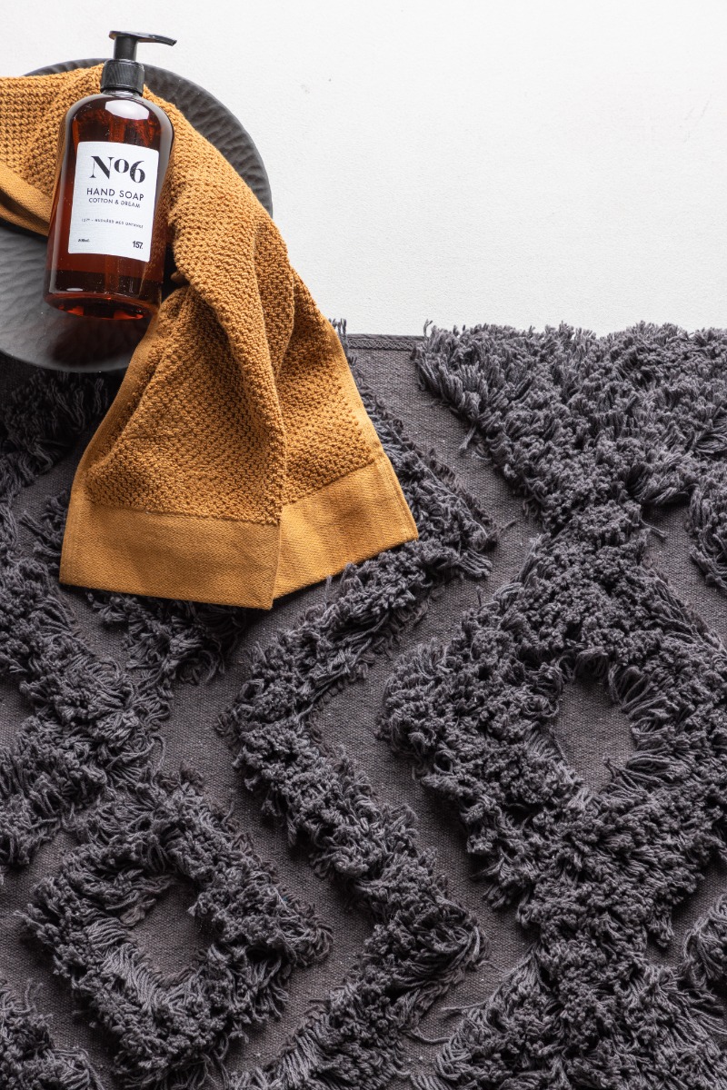 Denna mörkgrå badrumsmatta i bomull erbjuder både funktion och stil. Den mjuka texturen gör den behaglig att kliva på efter duschen medan det absorberande materialet bidrar till att hålla golvet torrt. Mattans tjocklek ger en skön dämpning och skyddar mot kalla klinkergolv. Passar perfekt i alla badrumsmiljöer och är enkel att underhålla med regelbunden tvätt. En praktisk och elegant detalj som förhöjer badrummets komfort och estetik.