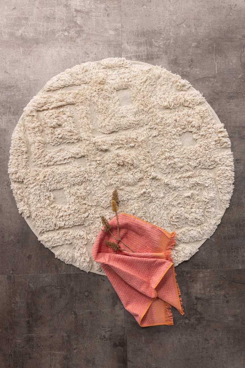 Offwhite rund badrumsmatta i mjuk bomull med 12 mm tjocklek ger komfort och absorberar effektivt. Stilren design som passar alla badrumsmiljöer.